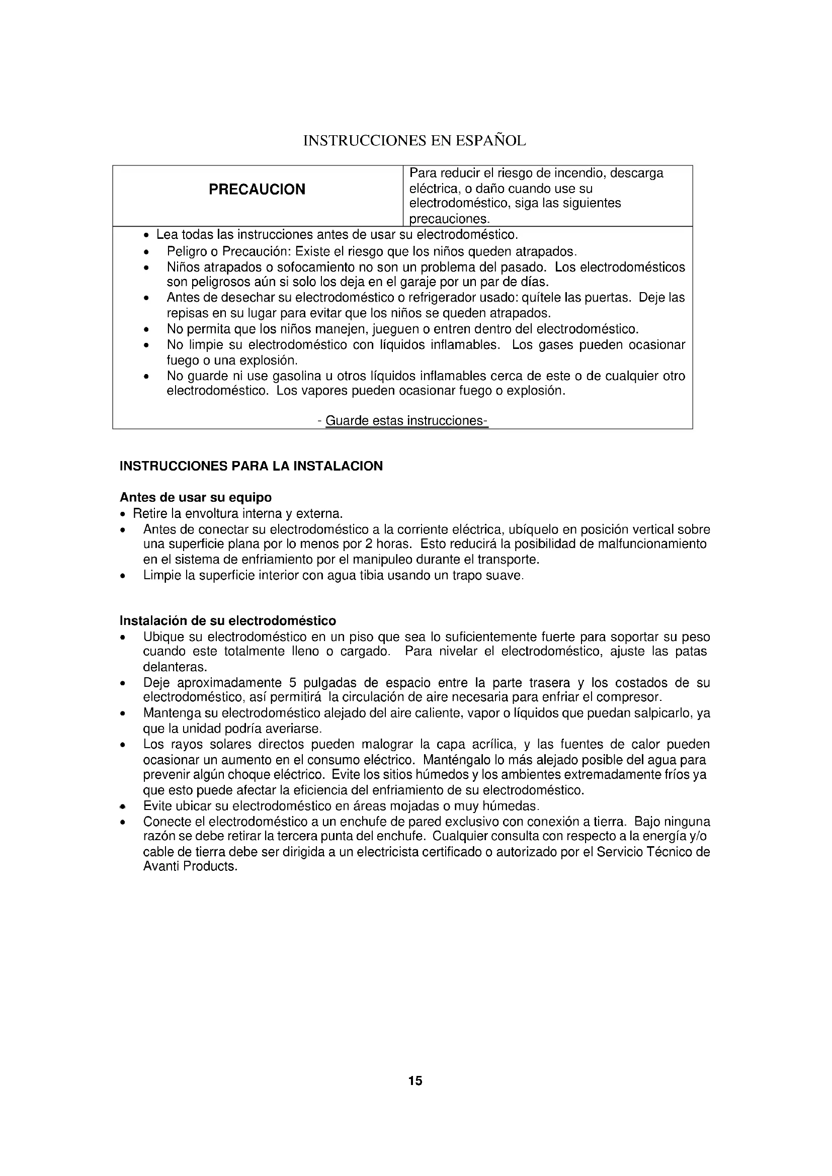 - Conecte el electrodoméstico a un enchufe de pared exclusivo con conexión a tierra. Bajo ninguna razón se debe retirar la tercera punta del enchufe. Cualquier consulta con respecto a la energía y/o cable de tierra debe ser dirigida a un electricista certificado o autorizado por el Servicio Técnico de Avanti Products.