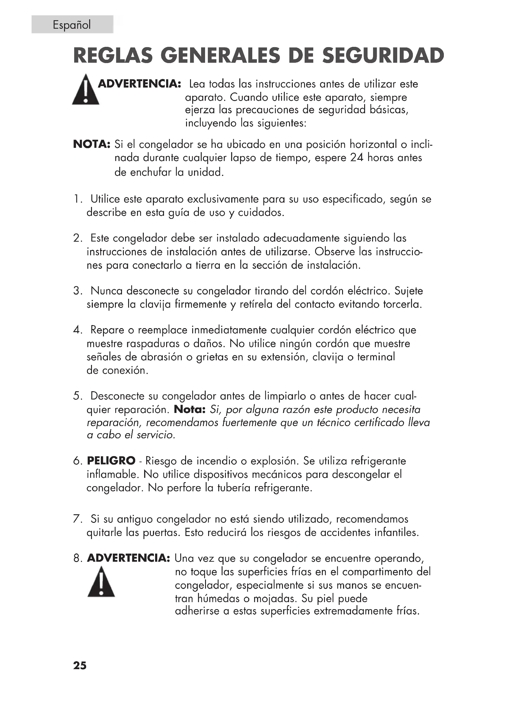 8. ADVERTENCIA: Una vez que su congelador se encuentre operando,