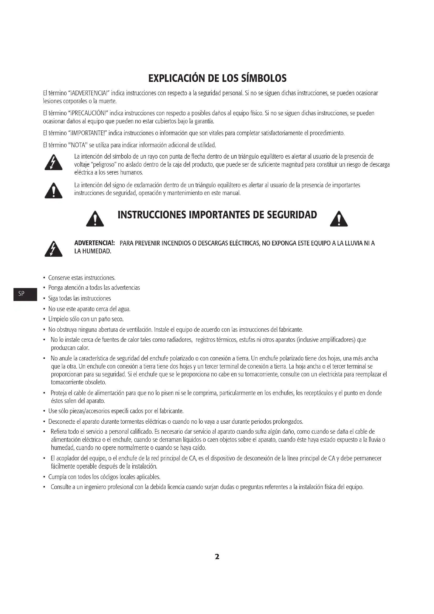 El término “¡ADVERTENCIA!” indica instrucciones con respecto a la seguridad personal. Si no se siguen dichas instrucciones, se pueden ocasionar lesiones corporales o la muerte. El término “¡PRECAUCIÓN!” indica instrucciones con respecto a posibles daños al equipo físico. Si no se siguen dichas instrucciones, se pueden ocasionar daños al equipo que pueden no estar cubiertos bajo la garantía. El término “¡IMPORTANTE!” indica instrucciones o información que son vitales para completar satisfactoriamente el procedimiento. El término "NOTA" se utiliza para indicar información adicional de utilidad. La intención del símbolo de un rayo con punta de fl echa dentro de un triángulo equilátero es alertar al usuario de la presencia de voltaje “peligroso” no aislado dentro de la caja del producto, que puede ser de sufi ciente magnitud para constituir un riesgo de descarga eléctrica a los seres humanos. La intención del signo de exclamación dentro de un triángulo equilátero es alertar al usuario de la presencia de importantes instrucciones de seguridad, operación y mantenimiento en este manual.