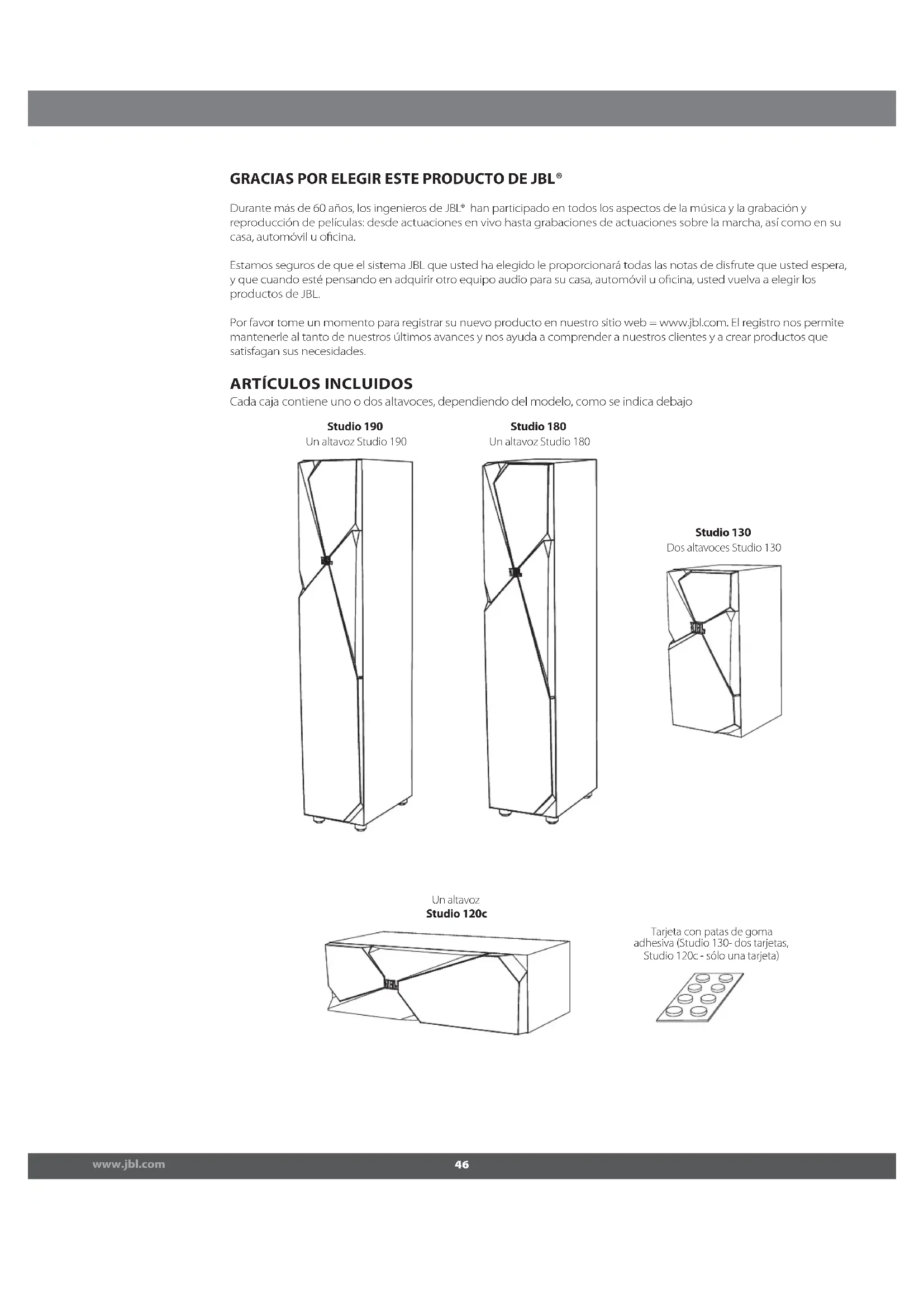 Cada caja contiene uno o dos altavoces, dependiendo del modelo, como se indica debajo GRACIAS POR ELEGIR ESTE PRODUCTO DE JBL® Studio 190 Un altavoz Studio 190 Studio 180 Un altavoz Studio 180 Studio 130 Dos altavoces Studio 130 Un altavoz Studio 120c Tarjeta con patas de goma adhesiva (Studio 130- dos tarjetas, Studio 120c - sólo una tarjeta)www.jbl.com