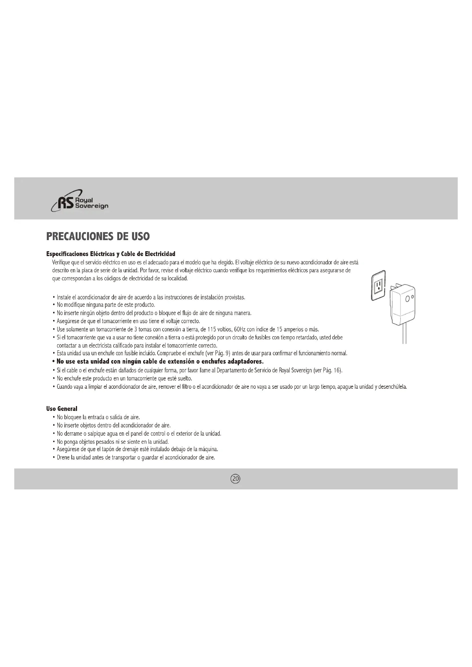 - Si el cable o el enchufe están dañados de cualquier forma, por favor llame al Departamento de Servicio de Royal Sovereign (ver Pág. 16).