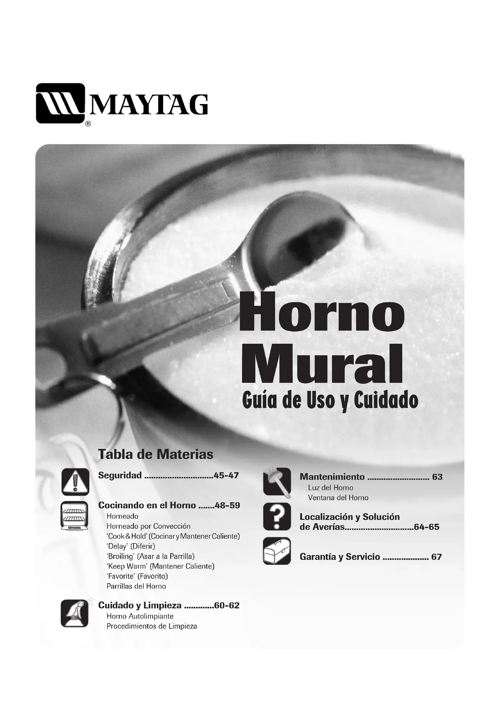Mantenimiento ........................... 63 Luz del HornoVentana del Horno Localización y Solución de Averías..............................64-65 Garantía y Servicio .................... 67 Reviewed by Stewart, Steven | ReleasedInstalador: Por favor deje esta guía junto con el electrodoméstico.Consumidor: Por favor lea y conserve esta guía para referenciafutura. Conserve el recibo de compra y/o el cheque cancelado comoprueba de compra.Número de Modelo ___________________________________Número de Serie _____________________________________Fecha de Compra ____________________________________Si tiene preguntas, llame a:Servicio a los clientes1-800-688-9900 E.E.U.U.1-800-688-2002 Canadá(Lunes a Viernes, 8:00 a.m. a 8:00 p.m. Hora del Este)Internet: http://www.maytag.comEn nuestro continuo afán de mejorar la calidad y rendimiento denuestros electrodomésticos, puede que sea necesario modificar elelectrodoméstico sin actualizar esta guía.Para información sobre servicio, ver página 67. INSTRUCCIONES IMPORTANTES SOBRE SEGURIDAD Las advertencias e instrucciones importantes sobre seguridad que aparecen en esta guía no están destinadas a cubrir todas las posibles circunstancias y situaciones que puedan ocurrir. Se debe ejercer sentido común, precaución y cuidado cuando instale, realice mantenimiento o haga funcionar el artefacto. Siempre póngase en contacto con su distribuidor, agente de servicio o fabricante si surgen problemas o situaciones que usted no comprenda. Reconozca los símbolos, advertencias, etiquetas de seguridad ADVERTENCIA - Peligro o prácticas no seguras que PODRIAN causar lesión personal grave o mortal. ATENCION - Peligros o prácticas no seguras que PODRIAN causar lesión personal menos grave. ADVERTENCIA ATENCION Lea y siga todas las instrucciones antes de usar este electrodoméstico para evitar el riesgo potencial de incendio, choque eléctrico, lesión personal o daño al electrodoméstico como resultado de su uso inapropiado. Utilice este electrodoméstico solamente para el propósito que ha sido destinado según se describe en esta guía. Para asegurar funcionamiento correcto y seguro: El electrodoméstico debe ser instalado debidamente y puesto a tierra por un técnico calificado. No intente ajustar, reparar, prestar servicio o reemplazar ninguna pieza de este producto a menos que sea específicamente recomendado en esta guía. Todas las reparaciones deben ser realizadas por un técnico calificado. Siempre desenchufe el electrodoméstico antes de efectuar alguna reparación. Para Evitar Daño a Causa de Incendio o Humo