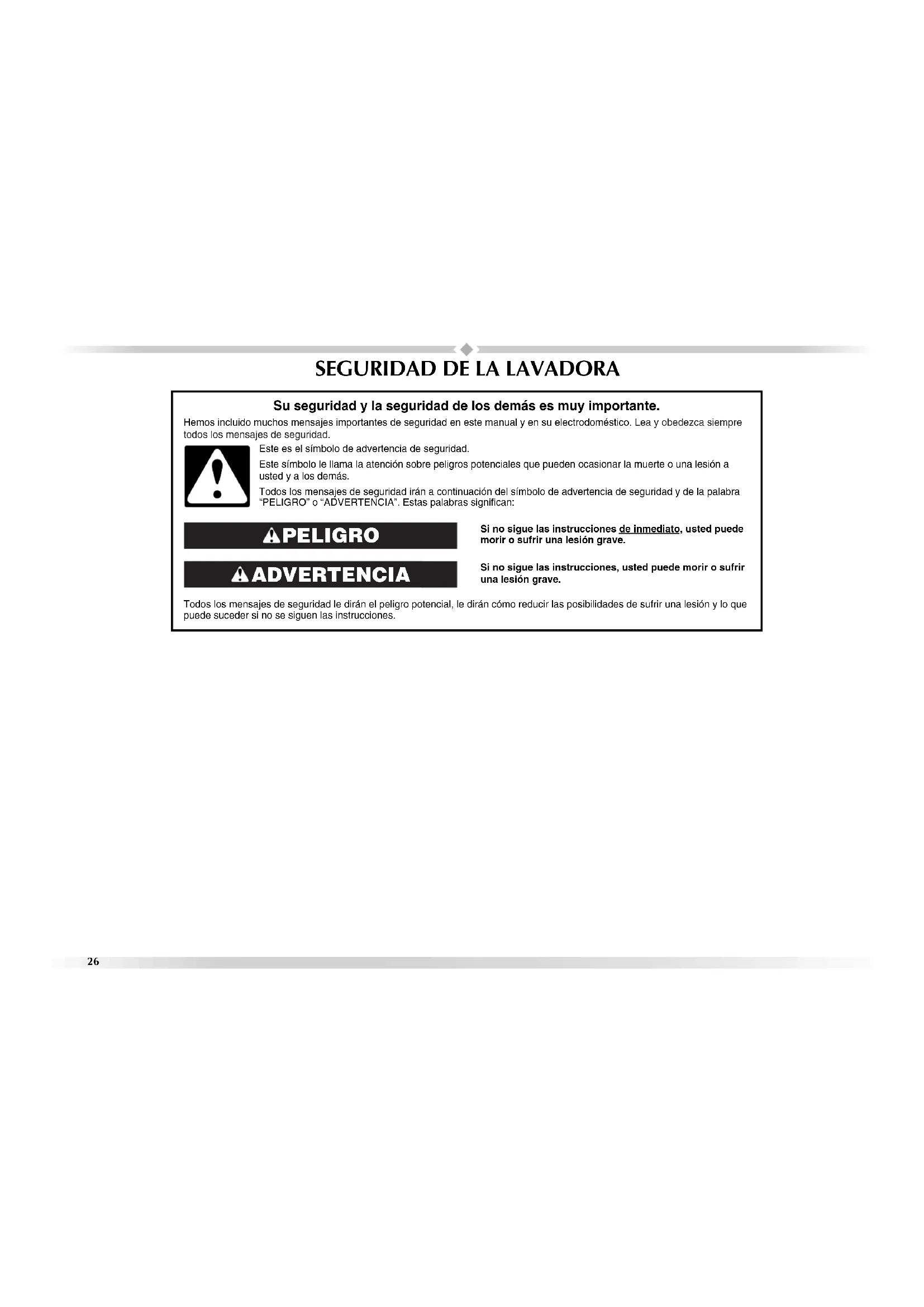 Si no sigue las instrucciones de inmediato, usted puede morir o sufrir una lesión grave. Si no sigue las instrucciones, usted puede morir o sufrir una lesión grave. Todos los mensajes de seguridad le dirán el peligro potencial, le dirán cómo reducir las posibilidades de sufrir una lesión y lo que puede suceder si no se siguen las instrucciones. Su seguridad y la seguridad de los demás es muy importante. Hemos incluido muchos mensajes importantes de seguridad en este manual y en su electrodoméstico. Lea y obedezca siempre todos los mensajes de seguridad. ADVERTENCIA PELIGRO Este es el símbolo de advertencia de seguridad. Este símbolo le llama la atención sobre peligros potenciales que pueden ocasionar la muerte o una lesión a usted y a los demás. Todos los mensajes de seguridad irán a continuación del símbolo de advertencia de seguridad y de la palabra “PELIGRO” o “ADVERTENCIA”. Estas palabras significan:27