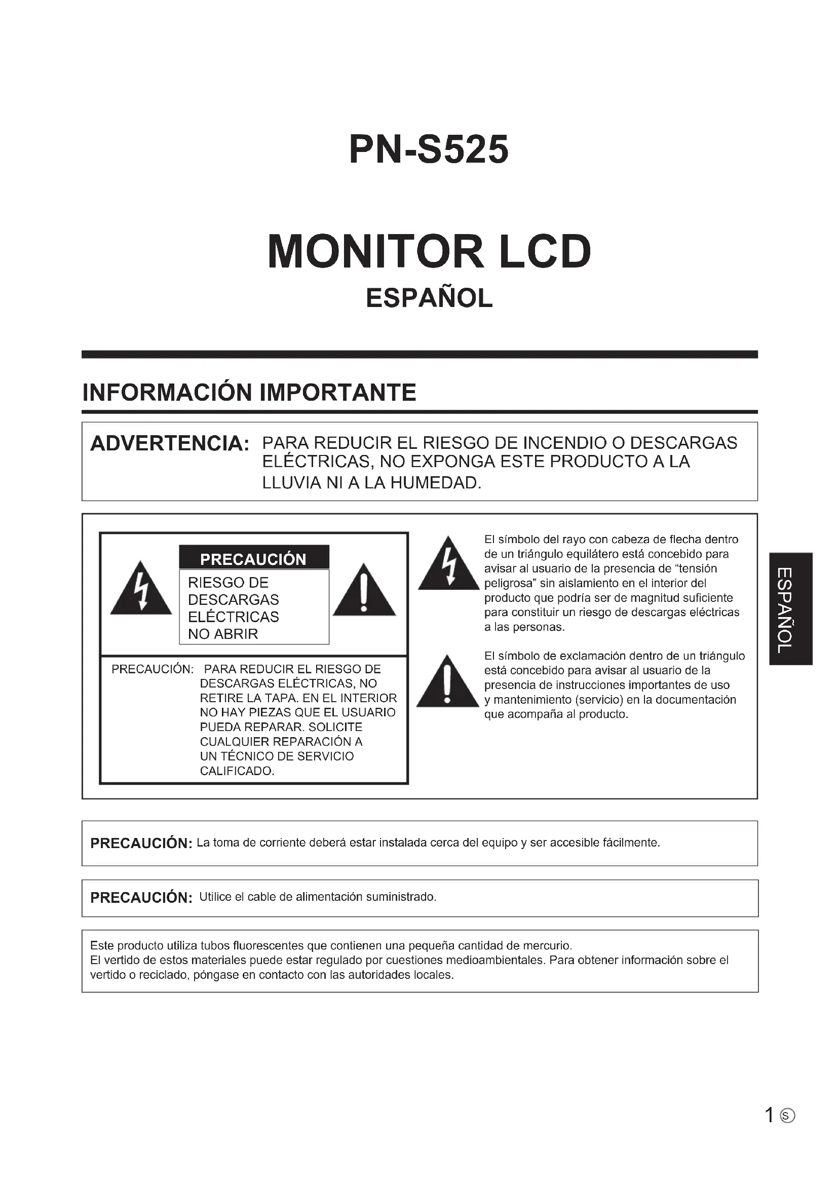 PN-S525 MONITOR LCD ESPAÑOL ADVERTENCIA: PARA REDUCIR EL RIESGO DE INCENDIO O DESCARGAS ELÉCTRICAS, NO EXPONGA ESTE PRODUCTO A LA LLUVIA NI A LA HUMEDAD.RIESGO DE DESCARGAS ELÉCTRICAS NO ABRIR PRECAUCIÓN PRECAUCIÓN: PARA REDUCIR EL RIESGO DE DESCARGAS ELÉCTRICAS, NO RETIRE LA TAPA. EN EL INTERIOR NO HAY PIEZAS QUE EL USUARIO PUEDA REPARAR. SOLICITE CUALQUIER REPARACIÓN A UN TÉCNICO DE SERVICIO CALIFICADO.El símbolo del rayo con cabeza de echa dentro de un triángulo equilátero está concebido para avisar al usuario de la presencia de “tensión peligrosa” sin aislamiento en el interior del producto que podría ser de magnitud suciente para constituir un riesgo de descargas eléctricas a las personas.El símbolo de exclamación dentro de un triángulo está concebido para avisar al usuario de la presencia de instrucciones importantes de uso y mantenimiento (servicio) en la documentación que acompaña al producto.PRECAUCIÓN: La toma de corriente deberá estar instalada cerca del equipo y ser accesible fácilmente. PRECAUCIÓN: Utilice el cable de alimentación suministrado.Este producto utiliza tubos uorescentes que contienen una pequeña cantidad de mercurio.El vertido de estos materiales puede estar regulado por cuestiones medioambientales. Para obtener información sobre el vertido o reciclado, póngase en contacto con las autoridades locales.2