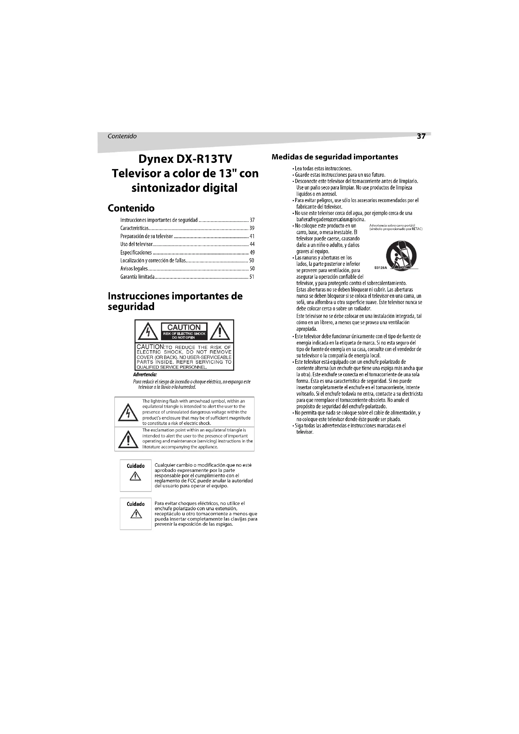 - Dynex DX-R13TV Televisor a color de 13" con sintonizador digital Contenido Instrucciones importantes de seguridad p. 37