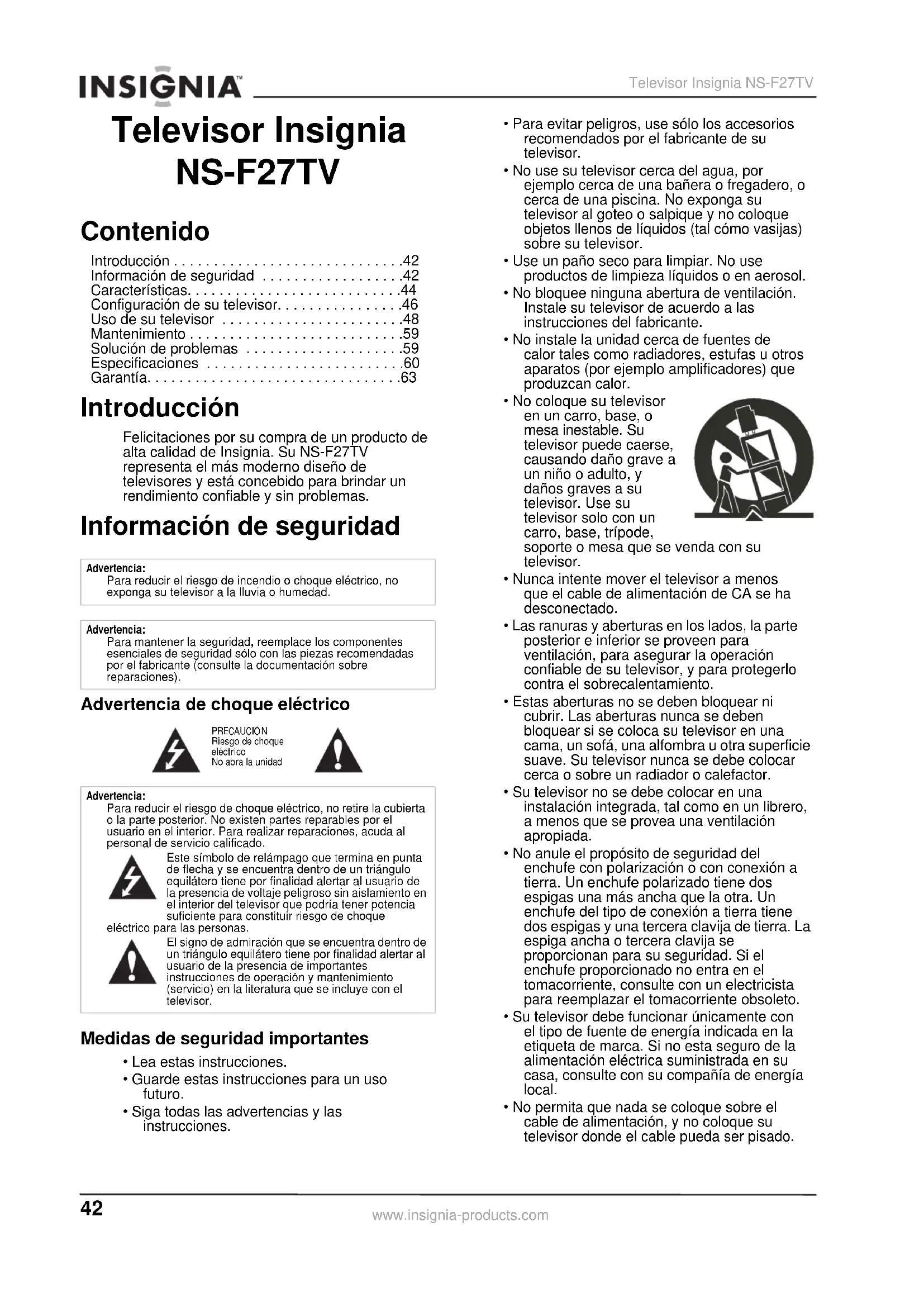 - Solicite consejo al distribuidor o a un técnico calificado para obtener ayuda. Advertencia de la FCC Cualquier cambio o modificación que no esté aprobado expresamente por la parte responsable por el cumplimiento con el reglamento de FCC puede anular la autoridad del usuario para operar el equipo. Certificación de seguridad de DHHS y FDA Este reproductor está hecho y probado para cumplir con los estándares de seguridad de los requisitos del FCC y con el rendimiento de seguridad del Departamento Estadounidense de Salud y Servicios Humanos, y también con los estándares de rendimiento de radiación del FDA 21 CFR, subcapítulo J. Declaración del ICES-003 de Canadá Este aparato digital de Clase B cumple con el ICES-003 canadiense. Declaración RSS 310 Para reducir el potencial de interferencia de radio a otros usuarios, el tipo de antena y su ganancia deben ser elegidos de tal forma que la potencia radiada equivalente (EIRP) no sea más que la permitida para una comunicación exitosa. Derechos de reproducción © 2007 Insignia. Insignia y el logotipo de Insignia son marcas de comercio de Best Buy Enterprise Services, Inc. Otras marcas y nombres de productos son marcas de comercio o marcas registradas de sus dueños respectivos. Las especificaciones y características están sujetas a cambio sin aviso previo u obligación. Para reparación y soporte llamar al (877) 467-4289.62 Televisor Insignia NS-F27TV www.insignia-products.com63 Televisor Insignia NS-F27TV www.insignia-products.com Garantía Garantía limitada de un año Insignia Products (“Insignia”) le garantiza a usted, el comprador original de este nuevo NS-F27TV (“Producto”), que éste se encontrará libre de defectos de material o de mano de obra en su fabricación original por un periodo de un (1) año a partir de la fecha de compra del Producto (“Período de Garantía”). Este Producto debe ser comprado en un distribuidor autorizado de productos Insignia y empacado con esta declaración de garantía. Esta garantía no cubre Productos reacondicionados. Si notifica a Insignia durante el Período de Garantía sobre un defecto cubierto por esta garantía que requiere reparación, los términos de esta garantía se aplican. ¿Cuánto dura la garantía? El Período de Garantía dura por 1 año (365 días) a partir de la fecha en que compró el Producto. La fecha de compra se encuentra impresa en el recibo que recibió con el Producto. ¿Qué es lo que cubre esta garantía? Durante el Período de Garantía, si un centro de reparación autorizado de Insignia concluye que la fabricación original del material o la mano de obra del Producto se encuentran defectuosos Insignia (cómo su opción exclusiva): (1) reparará el Producto con repuestos nuevos o reacondicionados; o (2) reemplazará el Producto con uno nuevo o con uno reacondicionado con repuestos equivalentes. Los Productos y repuestos reemplazados bajo esta garantía se volverán propiedad de Insignia y no se le regresarán a usted. Si se requiere la reparación de Productos o partes después de que se vence el Período de Garantía, usted deberá pagar todos los costos de mano de obra y de repuestos. Esta garantía estará vigente con tal que usted sea el dueño de su producto Insignia durante el periodo de garantía. El alcance de la garantía se termina si usted vende o transfiere el producto. ¿Cómo se obtiene la reparación de garantía? Si ha comprado el Producto en una tienda de ventas, lleve su recibo original y el Producto a la tienda en donde lo compró. Asegúrese de que vuelva a colocar el Producto en su empaque original o en un empaque que provea la misma protección que el original. Si compró el Producto en un sitio Web, envíe por correo su recibo original y el Producto a la dirección postal listada en el sitio Web. Asegúrese de colocar el Producto en su empaque original o en un empaque que provea la misma protección que el original. ¿En dónde es válida la garantía? Esta garantía sólo es válida al comprador original del producto en los Estados Unidos y en Canadá. ¿Qué es lo que no cubre la garantía? Esta garantía no cubre:• Capacitación del cliente• Instalación• Ajuste de configuración• Daños cosméticos• Daños debido a actos de la naturaleza, tal cómo rayos• Accidentes• Mal uso•Abuso• Negligencia• Uso comercial• Modificación de alguna parte del Producto, incluyendo la antenaEsta garantía tampoco cubre:• Daño debido al uso o mantenimiento incorrecto• La conexión a una fuente de voltaje incorrecta• El intento de reparación por alguien que no sea una compañía autorizada por Insignia para reparar el Producto• Productos vendidos tal cual (en el estado en que se encuentran) o con todas sus fallas• Productos consumibles, tal cómo fusibles o baterías• Productos en los cuales el número de serie asignado en la fábrica ha sido alterado o removido.EL REEMPLAZO DE REPARACIÓN SEGÚN PROVISTO BAJO ESTA GARANTÍA ES SU ÚNICO RECURSO. INSIGNIA NO SERÁ RESPONSABLE POR DAÑOS INCIDENTALES O CONSECUENTES DEBIDO AL INCUMPLIMIENTO DE CUALQUIER GARANTÍA EXPRESA O IMPLÍCITA RELACIONADA CON ESTE PRODUCTO, INCLUYENDO PERO SIN LIMITARSE A LA PÉRDIDA DE INFORMACIÓN, LA PÉRDIDA DE NEGOCIOS O DE GANANCIAS. INSIGNIA PRODUCTS NO HACE NINGUNA OTRA GARANTÍA EXPRESA E IMPLÍCITA RELACIONADA A ESTE PRODUCTO, INCLUYENDO PERO SIN LIMITARSE A, CUALQUIER GARANTÍA IMPLÍCITA DE O CONDICIONES DE COMERCIALIZACIÓN O IDONEIDAD PARA UN USO PARTICULAR, ESTÁN LIMITADAS EN DURACIÓN AL PERÍODO DE GARANTÍA DECLARADO ANTERIORMENTE Y NINGUNA GARANTÍA YA SEA EXPRESA O IMPLÍCITA SE APLICARÁ DESPUÉS DEL PERÍODO DE GARANTÍA. ALGUNOS ESTADOS, PROVINCIAS Y JURISDICCIONES NO PERMITEN RESTRICCIONES EN CUANTO A LA DURACIÓN DE UNA GARANTÍA IMPLÍCITA, ASÍ QUE LA RESTRICCIÓN ANTERIOR PUEDE NO APLICARSE EN SU CASO. ESTA GARANTÍA LE DA DERECHOS LEGALES ESPECÍFICOS, Y USTED PUEDE POSEER OTROS DERECHOS QUE VARÍAN DE ES