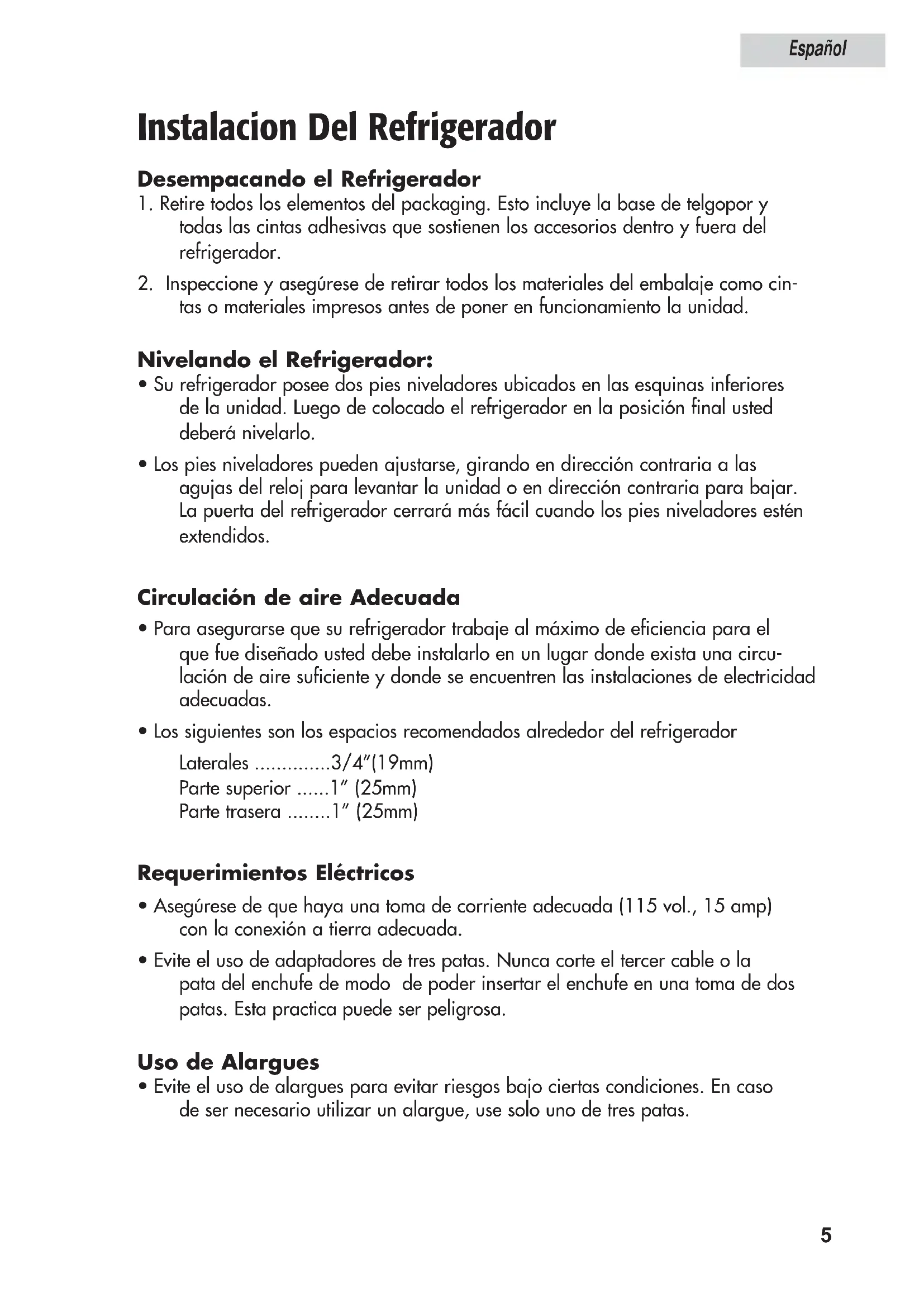 - Los siguientes son los espacios recomendados alrededor del refrigerador Laterales ..............3/4”(19mm) Parte superior ......1” (25mm) Parte trasera ........1” (25mm) Requerimientos Eléctricos