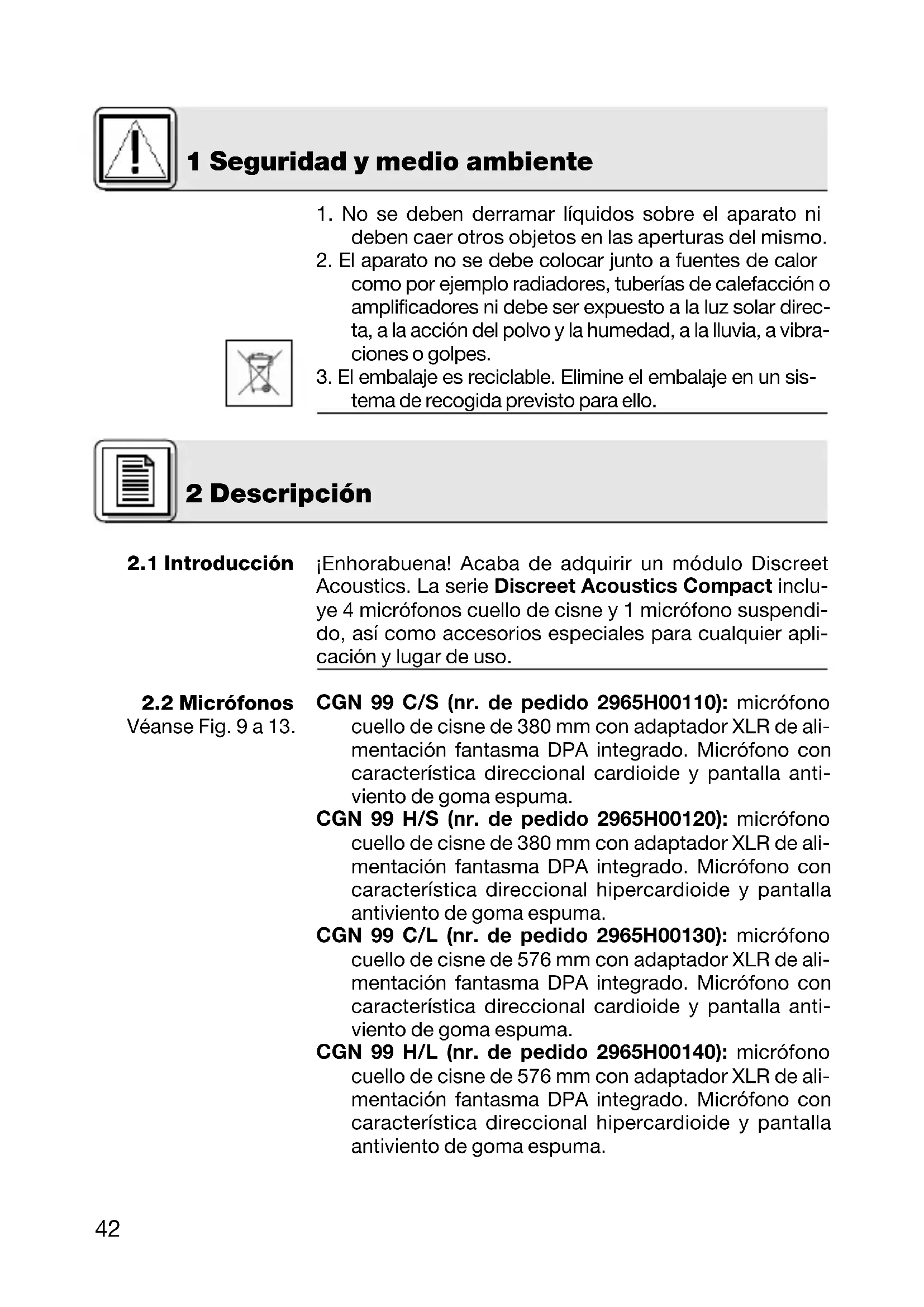 tema de recogida previsto para ello. ¡Enhorabuena! Acaba de adquirir un módulo Discreet Acoustics. La serie Discreet Acoustics Compact inclu- ye 4 micrófonos cuello de cisne y 1 micrófono suspendi- do, así como accesorios especiales para cualquier apli- cación y lugar de uso. CGN 99 C/S (nr. de pedido 2965H00110): micrófono cuello de cisne de 380 mm con adaptador XLR de ali- mentación fantasma DPA integrado. Micrófono con característica direccional cardioide y pantalla anti- viento de goma espuma. CGN 99 H/S (nr. de pedido 2965H00120): micrófono cuello de cisne de 380 mm con adaptador XLR de ali- mentación fantasma DPA integrado. Micrófono con característica direccional hipercardioide y pantalla antiviento de goma espuma. CGN 99 C/L (nr. de pedido 2965H00130): micrófono cuello de cisne de 576 mm con adaptador XLR de ali- mentación fantasma DPA integrado. Micrófono con característica direccional cardioide y pantalla anti- viento de goma espuma. CGN 99 H/L (nr. de pedido 2965H00140): micrófono cuello de cisne de 576 mm con adaptador XLR de ali- mentación fantasma DPA integrado. Micrófono con característica direccional hipercardioide y pantalla antiviento de goma espuma. 2 Descripción 1 Seguridad y medio ambiente 4457_09_AKG_BDA_GN-Compact_ps 10.09.2009 11:53 Uhr Seite 4243 2 Descripción Véase Fig. 14.