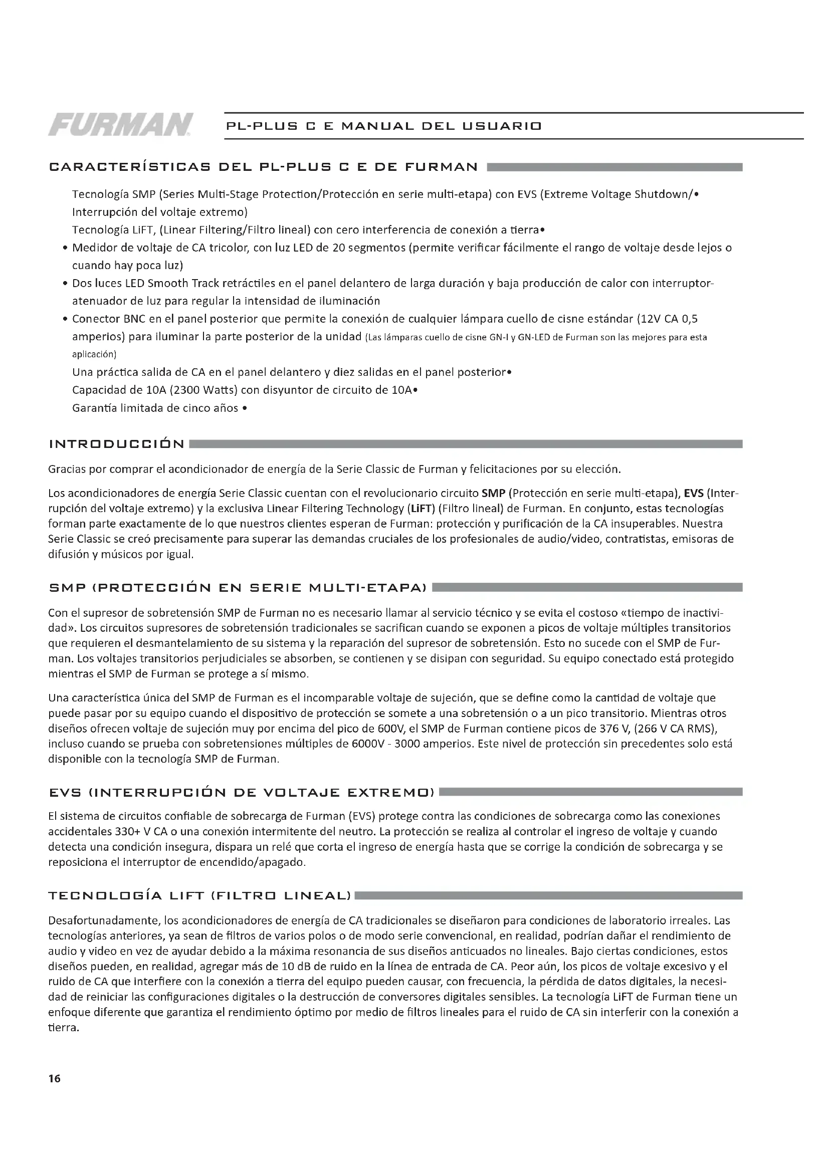 CARACTERÍSTICAS DEL PL-PLUS C E DE FURMAN Tecnología SMP (Series Mul-Stage Protecon/Protección en serie mul-etapa) con EVS (Extreme Voltage Shutdown/• Interrupción del voltaje extremo) Tecnología LiFT, (Linear Filtering/Filtro lineal) con cero interferencia de conexión a erra• Medidor de voltaje de CA tricolor, con luz LED de 20 segmentos (permite vericar fácilmente el rango de voltaje desde lejos o • cuando hay poca luz) Dos luces LED Smooth Track retrácles en el panel delantero de larga duración y baja producción de calor con interruptor-• atenuador de luz para regular la intensidad de iluminación Conector BNC en el panel posterior que permite la conexión de cualquier lámpara cuello de cisne estándar (12V CA 0,5 • amperios) para iluminar la parte posterior de la unidad (Las lámparas cuello de cisne GN-I y GN-LED de Furman son las mejores para esta aplicación) Una prácca salida de CA en el panel delantero y diez salidas en el panel posterior• Capacidad de 10A (2300 Was) con disyuntor de circuito de 10A• Garana limitada de cinco años • INTRODUCCIÓN Gracias por comprar el acondicionador de energía de la Serie Classic de Furman y felicitaciones por su elección. Los acondicionadores de energía Serie Classic cuentan con el revolucionario circuito SMP (Protección en serie mul-etapa), EVS (Inter- rupción del voltaje extremo) y la exclusiva Linear Filtering Technology (LiFT) (Filtro lineal) de Furman. En conjunto, estas tecnologías forman parte exactamente de lo que nuestros clientes esperan de Furman: protección y puricación de la CA insuperables. Nuestra Serie Classic se creó precisamente para superar las demandas cruciales de los profesionales de audio/video, contrastas, emisoras de difusión y músicos por igual. SMP (PROTECCIÓN EN SERIE MULTI-ETAPA) Con el supresor de sobretensión SMP de Furman no es necesario llamar al servicio técnico y se evita el costoso «empo de inacvi- dad». Los circuitos supresores de sobretensión tradicionales se sacrican cuando se exponen a picos de voltaje múlples transitorios que requieren el desmantelamiento de su sistema y la reparación del supresor de sobretensión. Esto no sucede con el SMP de Fur- man. Los voltajes transitorios perjudiciales se absorben, se conenen y se disipan con seguridad. Su equipo conectado está protegido mientras el SMP de Furman se protege a sí mismo. Una caracterísca única del SMP de Furman es el incomparable voltaje de sujeción, que se dene como la candad de voltaje que puede pasar por su equipo cuando el disposivo de protección se somete a una sobretensión o a un pico transitorio. Mientras otros diseños ofrecen voltaje de sujeción muy por encima del pico de 600V, el SMP de Furman conene picos de 376 V, (266 V CA RMS), incluso cuando se prueba con sobretensiones múlples de 6000V - 3000 amperios. Este nivel de protección sin precedentes solo está disponible con la tecnología SMP de Furman. EVS (INTERRUPCIÓN DE VOLTAJE EXTREMO) El sistema de circuitos conable de sobrecarga de Furman (EVS) protege contra las condiciones de sobrecarga como las conexiones accidentales 330+ V CA o una conexión intermitente del neutro. La protección se realiza al controlar el ingreso de voltaje y cuando detecta una condición insegura, dispara un relé que corta el ingreso de energía hasta que se corrige la condición de sobrecarga y se reposiciona el interruptor de encendido/apagado. TECNOLOGÍA LIFT (FILTRO LINEAL) Desafortunadamente, los acondicionadores de energía de CA tradicionales se diseñaron para condiciones de laboratorio irreales. Las tecnologías anteriores, ya sean de ltros de varios polos o de modo serie convencional, en realidad, podrían dañar el rendimiento de audio y video en vez de ayudar debido a la máxima resonancia de sus diseños ancuados no lineales. Bajo ciertas condiciones, estos diseños pueden, en realidad, agregar más de 10 dB de ruido en la línea de entrada de CA. Peor aún, los picos de voltaje excesivo y el ruido de CA que interere con la conexión a erra del equipo pueden causar, con frecuencia, la pérdida de datos digitales, la necesi- dad de reiniciar las conguraciones digitales o la destrucción de conversores digitales sensibles. La tecnología LiFT de Furman ene un enfoque diferente que garanza el rendimiento ópmo por medio de ltros lineales para el ruido de CA sin interferir con la conexión a erra.17 FRANÇAIS ENGLISH ESPAÑOL DEUTSCH