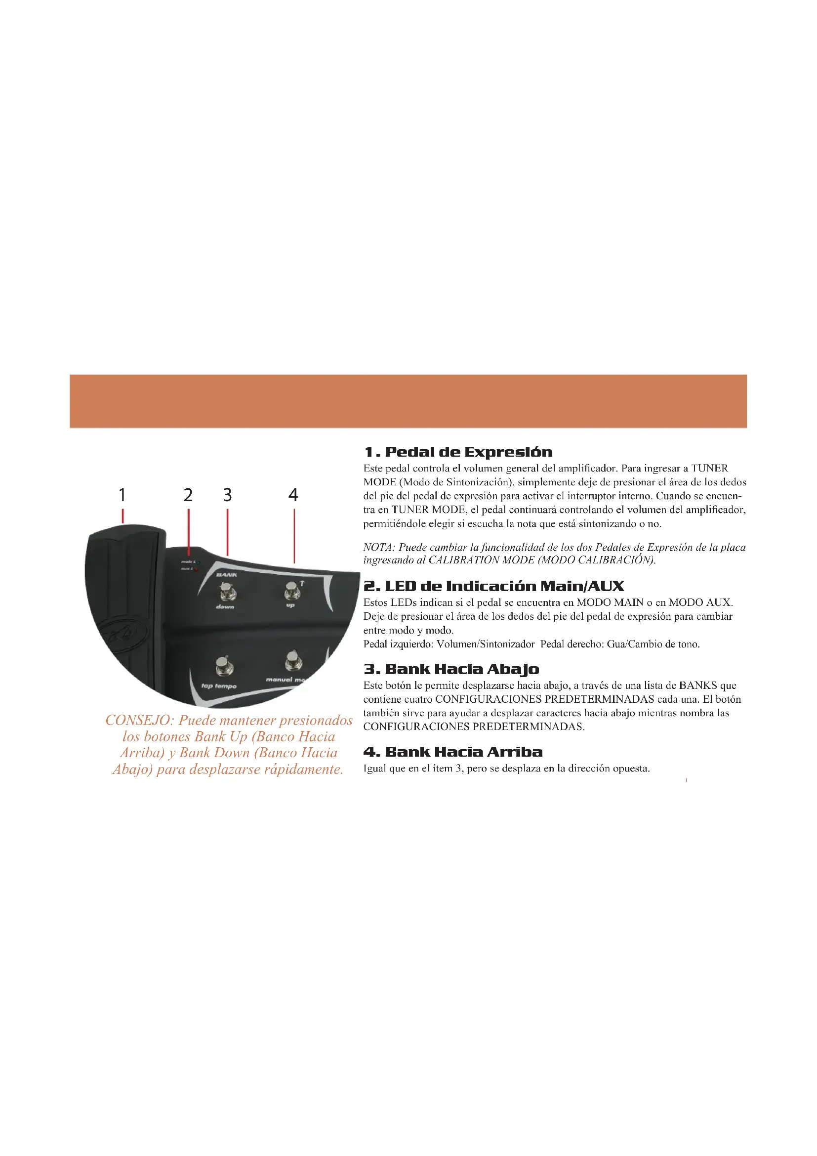CONTROLES LOOPER 6. Grabar/Reproducir¡Pasará horas en esto! Para grabar un bucle para reproducirlo, simplemente comience a tocar; cuando desee START (comenzar) el bucle, presione este botón y el amplicador comenzará a grabar el bucle. Cuando desee STOP (detener) la grabación, presione nuevamente este botón y el looper dejará de grabar y comenzará a reproducir automáticamente.7. Stop/ResetPara STOP (detener) un bucle que esté en proceso, presione este botón. Para BORRAR el bucle que está guardado actualmente (grabado presionando el botón 6), presione y sostenga este botón durante 3 segundos.8. LED de Indicación Main/AUXEstos LEDs indican si los pedales se encuentran en MODO MAIN o en MODO AUX. Deje de presionar el área de los dedos del pie del pedal de expresión para cambiar entre modo y modo. Main fuera de la caja indica Gua; Aux indica Cambio de Tono.9. Pedal de ExpresiónCuando se encuentra activo, este pedal controla un gua universal. Para activar el gua, deje de presionar el área de los dedos del pie del interruptor de pie. Cuando se selecciona Cambio de Tono en el amplicador, este pedal controla el tono de la señal.