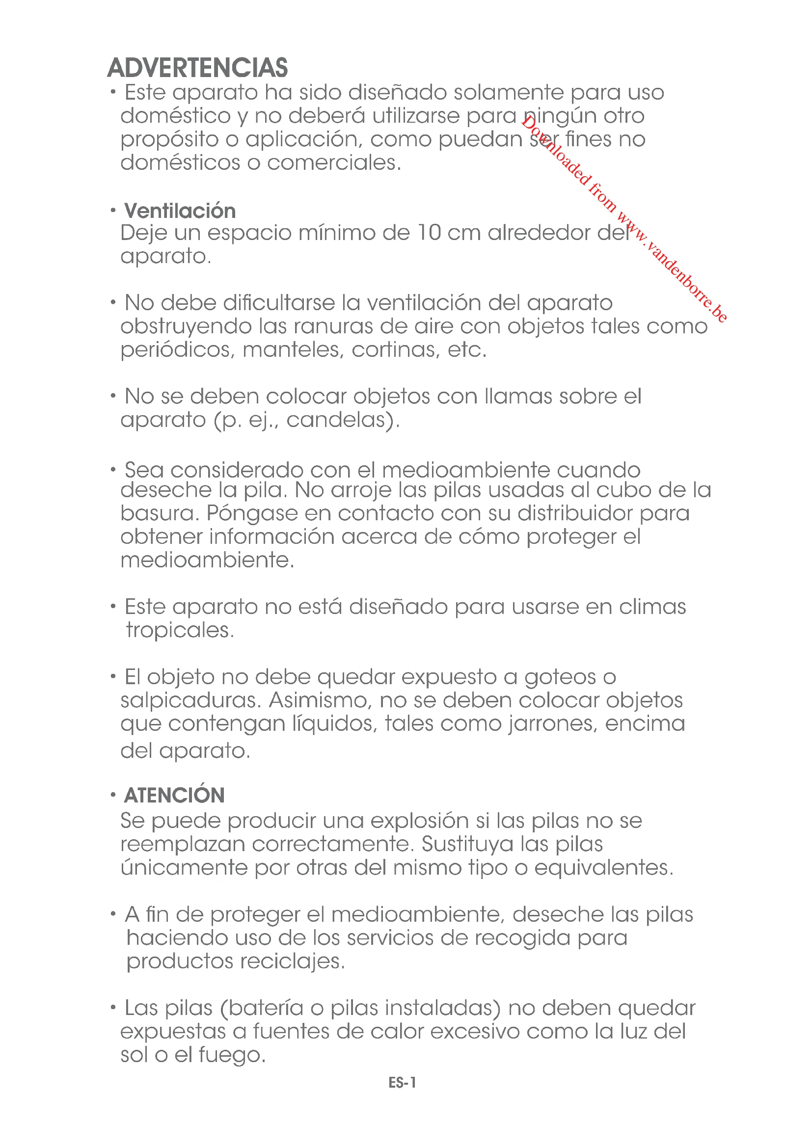 Limpie la unidad con un paño suave humedecido y séquela con un paño seco. Nunca lo sumerja el aparato en agua. No utilice limpiadores químicos o abrasivos. Guarde la unidad en un lugar fresco y seco, alejada del polvo y la suciedad. ES-6 第23頁 Downloaded from www.vandenborre.beDISPOSICIÓN Como comerciantes responsables nos preocupamos del medioambiente. Como tal le instamos a seguir el procedimiento correcto para la disposición del producto, materiales de embalaje y, de aplicarse, accesorios y pilas. Esto ayudará a conservar los recursos naturales y asegurarse de que los materiales son reciclados de una manera que protege la salud y el medioambiente. Deberá seguir las leyes y regulaciones sobre la disposición. Los productos eléctricos y pilas deberán desecharse separadamente de los residuos domésticos cuando estos alcanzan el final de su vida activa. Contacte al comercio donde adquirió el producto y a su autoridad local para conocer más sobre disposición y reciclaje. Las pilas deberán ser desechadas en su centro local de recolección para reciclaje. Consulte las instrucciones de funcionamiento para ver como extraer las pilas para su disposición. Pedimos disculpas por cualquier inconveniencia causada por las menores inconsistencias en las instrucciones de funcionamiento, que pueden ocurrir como resultado de la mejora y desarrollo del producto. Darty Holdings SAS © 14 route d’Aulnay 93140 Bondy, France 18 / 01 / 2017 ES-7 第24頁 Downloaded from www.vandenborre.bePT-1 第25頁 AVISOS