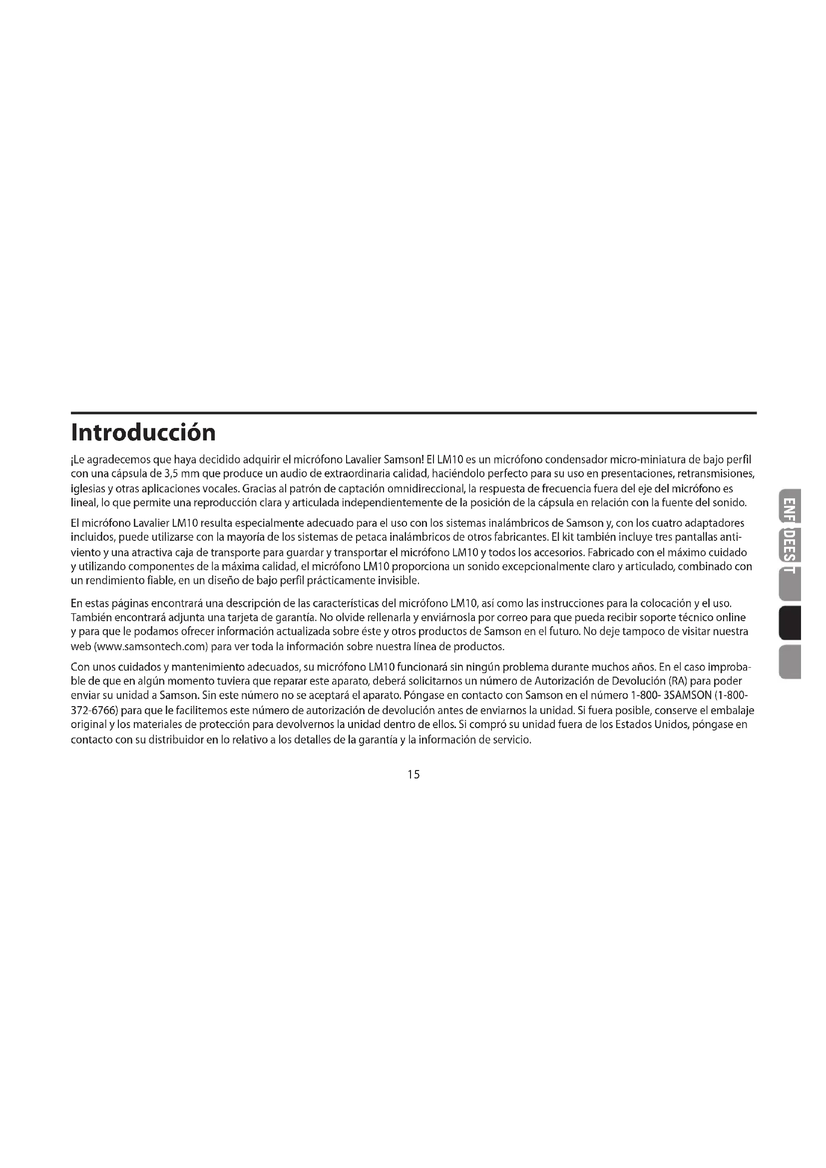 - Installieren Sie für Aufnahme im Freien oder um Atemgeräusche zu reduzieren eine der mitgelieferten Schutzvorrichtungen.14 Richtcharakteristik Frequenzgang Element: . . . . . . . . . . . . . . .Back-Elektret Kondensator Richtcharakteristik: . . . . . . . .Omnidirektional Frequenzgang: . . . . . . . . . . .20Hz-20KHz Empndlichkeit : . . . . . . . . . .-45±3dB 1V/Pa bei 1khz Ausgangsimpedanz: . . . . . . .2KΩ±30% SPL max: . . . . . . . . . . . . . . .140dB Betriebsspannung: . . . . . . . .1,5 - 12V D.C Kabel: . . . . . . . . . . . . . . . . .Φ 1,4mm x 1,2m Gewicht: . . . . . . . . . . . . . . .13g Maße: . . . . . . . . . . . . . . . . .Φ3.5mm Ausgangsanschlüsse: . . . . . . .2,5mm Beigefügte Adapter . . . . . . . .Shure, AT, AKG, Sennhieser Zubehör: . . . . . . . . . . . . . . .Schutzvorrichtung, Clip Spezifikationen können ohne vorherige Ankündigung geändert werden. Spezifikationen15 EN FR DE ES IT Introducción ¡Le agradecemos que haya decidido adquirir el micrófono Lavalier Samson! El LM10 es un micrófono condensador micro-miniatura de bajo perfil con una cápsula de 3,5 mm que produce un audio de extraordinaria calidad, haciéndolo perfecto para su uso en presentaciones, retransmisiones, iglesias y otras aplicaciones vocales. Gracias al patrón de captación omnidireccional, la respuesta de frecuencia fuera del eje del micrófono es lineal, lo que permite una reproducción clara y articulada independientemente de la posición de la cápsula en relación con la fuente del sonido. El micrófono Lavalier LM10 resulta especialmente adecuado para el uso con los sistemas inalámbricos de Samson y, con los cuatro adaptadores incluidos, puede utilizarse con la mayoría de los sistemas de petaca inalámbricos de otros fabricantes. El kit también incluye tres pantallas anti- viento y una atractiva caja de transporte para guardar y transportar el micrófono LM10 y todos los accesorios. Fabricado con el máximo cuidado y utilizando componentes de la máxima calidad, el micrófono LM10 proporciona un sonido excepcionalmente claro y articulado, combinado con un rendimiento fiable, en un diseño de bajo perfil prácticamente invisible. En estas páginas encontrará una descripción de las características del micrófono LM10, así como las instrucciones para la colocación y el uso. También encontrará adjunta una tarjeta de garantía. No olvide rellenarla y enviárnosla por correo para que pueda recibir soporte técnico online y para que le podamos ofrecer información actualizada sobre éste y otros productos de Samson en el futuro. No deje tampoco de visitar nuestra web (www.samsontech.com) para ver toda la información sobre nuestra línea de productos. Con unos cuidados y mantenimiento adecuados, su micrófono LM10 funcionará sin ningún problema durante muchos años. En el caso improba- ble de que en algún momento tuviera que reparar este aparato, deberá solicitarnos un número de Autorización de Devolución (RA) para poder enviar su unidad a Samson. Sin este número no se aceptará el aparato. Póngase en contacto con Samson en el número 1-800- 3SAMSON (1-800- 372-6766) para que le facilitemos este número de autorización de devolución antes de enviarnos la unidad. Si fuera posible, conserve el embalaje original y los materiales de protección para devolvernos la unidad dentro de ellos. Si compró su unidad fuera de los Estados Unidos, póngase en contacto con su distribuidor en lo relativo a los detalles de la garantía y la información de servicio.16 Características del LM10 El Micrófono Lavalier Omnidireccional LM10 proporciona una reproducción vocal exce- lente en una unidad de diseño de bajo perfil casi invisible. Las características principales del LM10 son las siguientes: