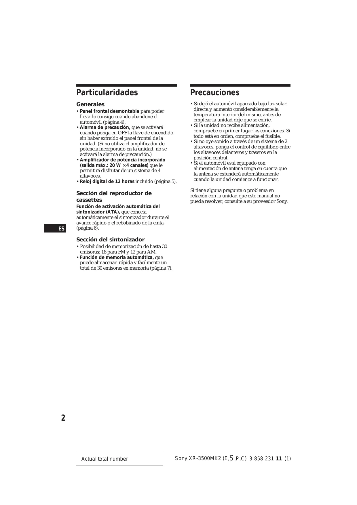 - Si el automóvil está equipado con alimentación de antena tenga en cuenta que la antena se extenderá automáticamente cuando la unidad comience a funcionar. Sección del reproductor de cassettes Si tiene alguna pregunta o problema en relación con la unidad que este manual no pueda resolver, consulte a su proveedor Sony. Función de activación automática del sintonizador (ATA), que conecta automáticamente el sintonizador durante el avance rápido o el rebobinado de la cinta (página 6). Sección del sintonizador