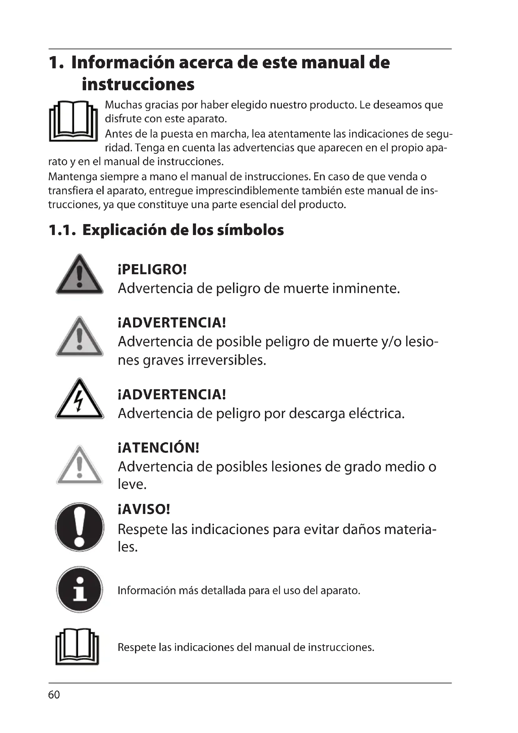 instrucciones Muchas gracias por haber elegido nuestro producto. Le deseamos que disfrute con este aparato. Antes de la puesta en marcha, lea atentamente las indicaciones de segu- ridad. Tenga en cuenta las advertencias que aparecen en el propio apa- rato y en el manual de instrucciones. Mantenga siempre a mano el manual de instrucciones. En caso de que venda o transfiera el aparato, entregue imprescindiblemente también este manual de ins- trucciones, ya que constituye una parte esencial del producto. 1.1. Explicación de los símbolos ¡PELIGRO! Advertencia de peligro de muerte inminente. ¡ADVERTENCIA! Advertencia de posible peligro de muerte y/o lesio- nes graves irreversibles. ¡ADVERTENCIA! Advertencia de peligro por descarga eléctrica. ¡ATENCIÓN! Advertencia de posibles lesiones de grado medio o leve. ¡AVISO! Respete las indicaciones para evitar daños materia- les. Información más detallada para el uso del aparato. Respete las indicaciones del manual de instrucciones.DE