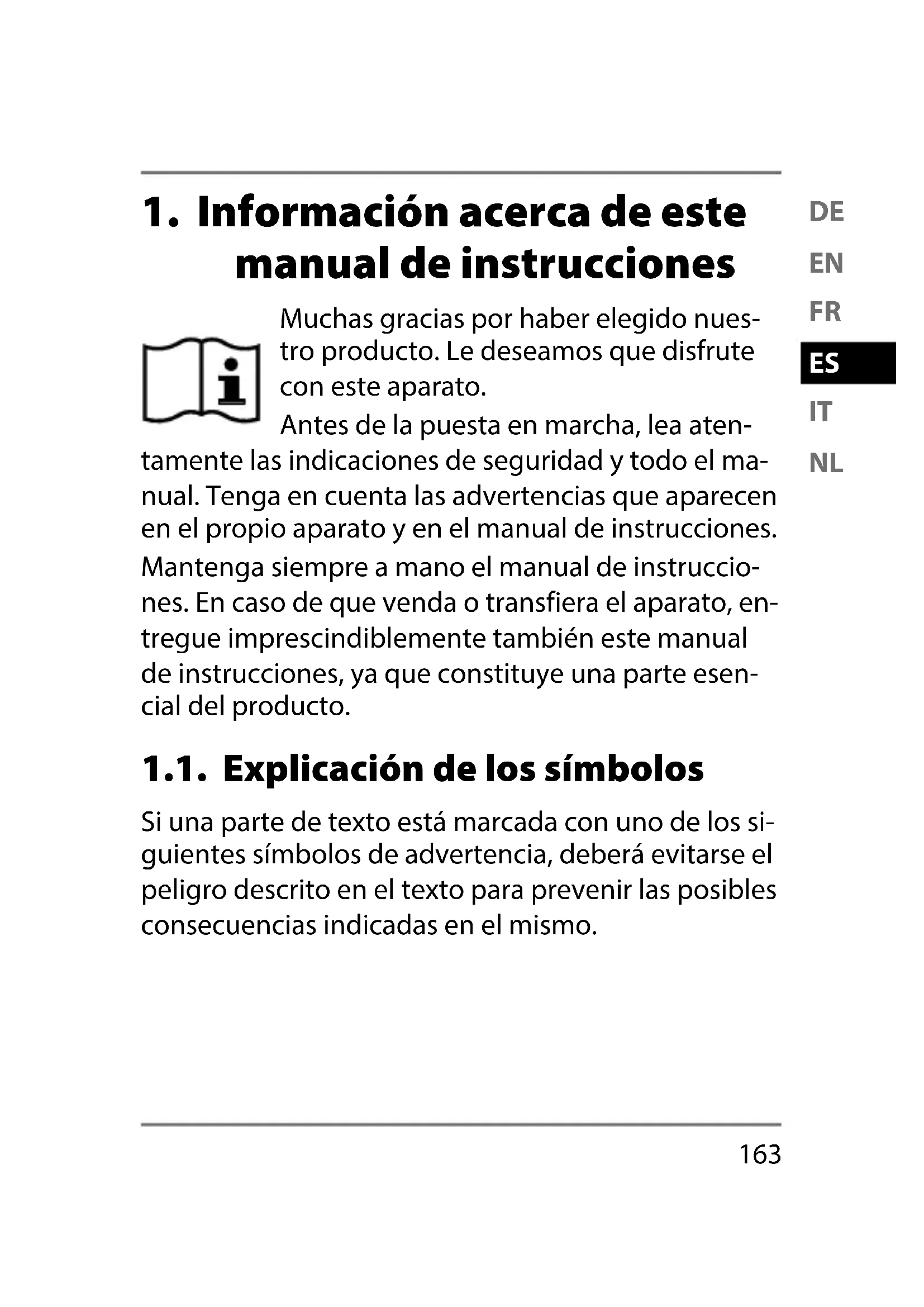 manual de instrucciones Muchas gracias por haber elegido nues- tro producto. Le deseamos que disfrute con este aparato. Antes de la puesta en marcha, lea aten- tamente las indicaciones de seguridad y todo el ma- nual. Tenga en cuenta las advertencias que aparecen en el propio aparato y en el manual de instrucciones. Mantenga siempre a mano el manual de instruccio- nes. En caso de que venda o transfiera el aparato, en- tregue imprescindiblemente también este manual de instrucciones, ya que constituye una parte esen- cial del producto. 1.1. Explicación de los símbolos Si una parte de texto está marcada con uno de los si- guientes símbolos de advertencia, deberá evitarse el peligro descrito en el texto para prevenir las posibles consecuencias indicadas en el mismo. 43954 ML DirectSales Final Content 5006 0681.indb 16343954 ML DirectSales Final Content 5006 0681.indb 163 22.02.2019 08:23:5422.02.2019 08:23:54164 ¡PELIGRO! ¡Advertencia de peligro de muer- te inminente! ¡ADVERTENCIA! ¡Advertencia de posible peligro de muerte y/o lesiones graves irreversibles! ¡ATENCIÓN! ¡Advertencia de posibles lesiones de grado medio o leve! ¡AVISO! ¡Observe las indicaciones para evitar daños materiales! ¡Información más detallada para el uso del aparato! ¡Observe las indicaciones del manual de instrucciones! 43954 ML DirectSales Final Content 5006 0681.indb 16443954 ML DirectSales Final Content 5006 0681.indb 164 22.02.2019 08:23:5422.02.2019 08:23:54165