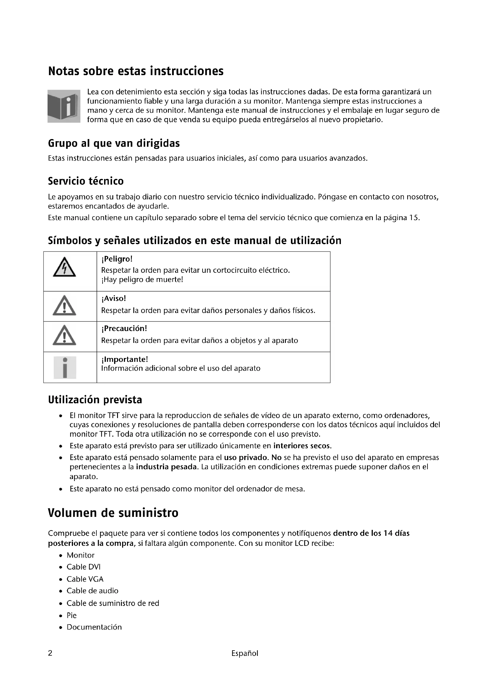 Notas sobre estas instrucciones Lea con detenimiento esta sección y siga todas las instrucciones dadas. De esta forma garantizará un funcionamiento fiable y una larga duración a su monitor. Mantenga siempre estas instrucciones a mano y cerca de su monitor. Mantenga este manual de instrucciones y el embalaje en lugar seguro de forma que en caso de que venda su equipo pueda entregárselos al nuevo propietario. Grupo al que van dirigidas Estas instrucciones están pensadas para usuarios iniciales, así como para usuarios avanzados. Servicio técnico Le apoyamos en su trabajo diario con nuestro servicio técnico individualizado. Póngase en contacto con nosotros, estaremos encantados de ayudarle. Este manual contiene un capítulo separado sobre el tema del servicio técnico que comienza en la página 15. Símbolos y señales utilizados en este manual de utilización ¡Peligro! Respetar la orden para evitar un cortocircuito eléctrico. ¡Hay peligro de muerte! ¡Aviso! Respetar la orden para evitar daños personales y daños físicos. ¡Precaución! Respetar la orden para evitar daños a objetos y al aparato ¡Importante! Información adicional sobre el uso del aparato Utilización prevista El monitor TFT sirve para la reproduccion de señales de vídeo de un aparato externo, como ordenadores, cuyas conexiones y resoluciones de pantalla deben corresponderse con los datos técnicos aquí incluidos del monitor TFT. Toda otra utilización no se corresponde con el uso previsto. Este aparato está previsto para ser utilizado únicamente en interiores secos. Este aparato está pensado solamente para el uso privado. No se ha previsto el uso del aparato en empresas pertenecientes a la industria pesada. La utilización en condiciones extremas puede suponer daños en el aparato. Este aparato no está pensado como monitor del ordenador de mesa. Volumen de suministro Compruebe el paquete para ver si contiene todos los componentes y notifíquenos dentro de los 14 días posteriores a la compra, si faltara algún componente. Con su monitor LCD recibe: Monitor Cable DVI Cable VGA Cable de audio Cable de suministro de red Pie DocumentaciónInstrucciones de seguridad
