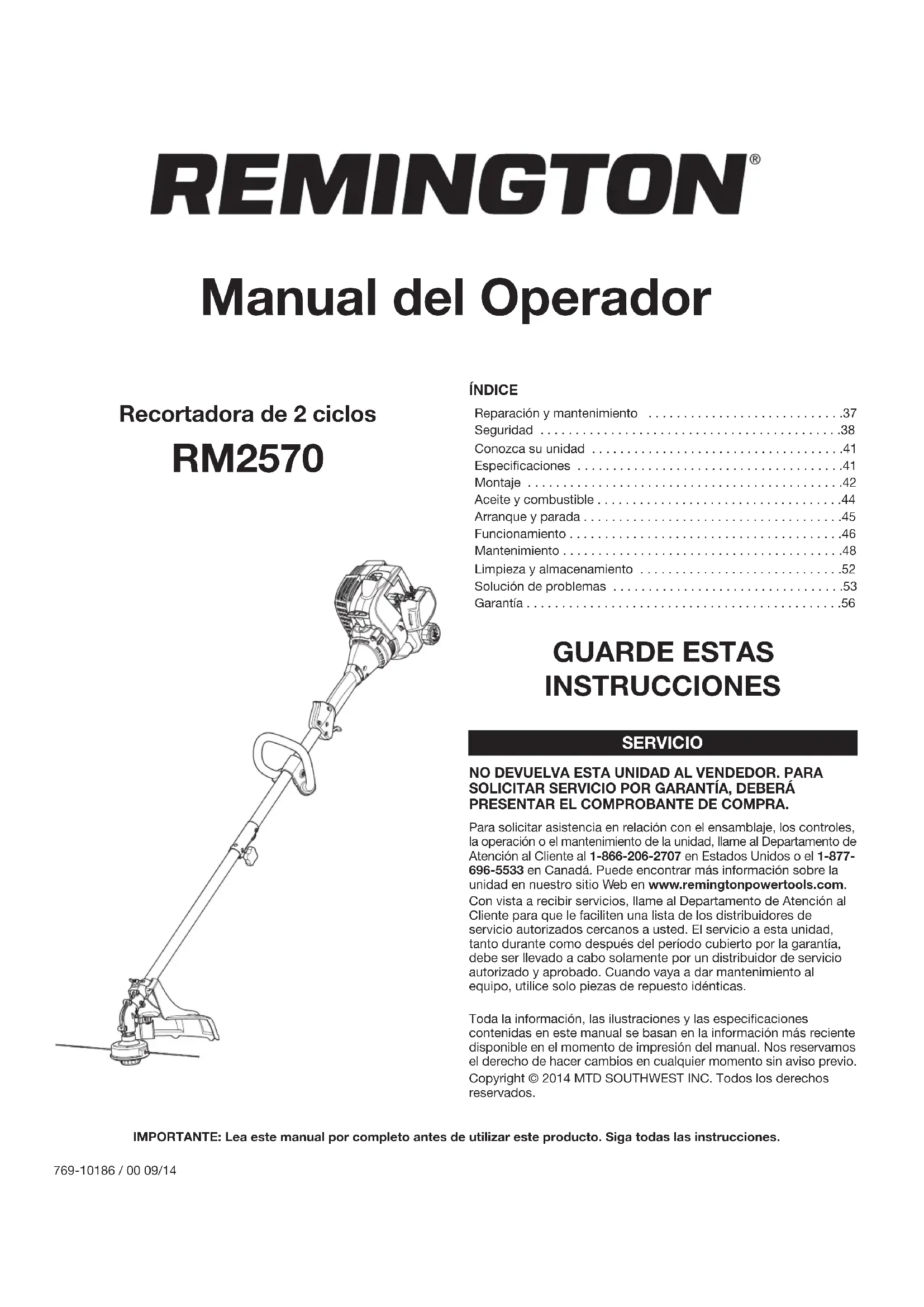 AL MOTOR LE FALTA POTENCIA O SE PARA EL CABEZAL DE CORTE NO HACE AVANZAR EL HILO EL HILO DE CORTE AVANZA SIN CONTROL54 NOTAS55 NOTASRemington LLC concede la garantía limitada establecida debajo para mercancías nuevas que sean compradas y usadas en los Estados Unidos, sus posesiones y territorios. Remington LLC garantiza este producto contra defectos en el material y la mano de obra durante un período de dos (2) años, a partir de la fecha de compra original y a su entera discreción, arreglará o substituirá sin costo alguno cualquier pieza cuyo material o mano de obra se considere defectuoso. Esta garantía limitada se deberá aplicar únicamente si este producto ha sido manejado y mantenido de acuerdo al Manual del Operario incluido con el producto y, si no ha sido sometido a mal uso, abuso, uso comercial, negligencia, accidente, mantenimiento inapropiado, alteración, vandalismo, hurto, fuego, agua o daños debidos a otros riesgos o desastre natural. Los daños ocasionados por la instalación o el uso de cualquier accesorio o aditamento que no esté aprobado por Remington y que sea usado con el (los) producto(s) contemplados en este manual, anularán la garantía con respecto a cualquier daño resultante. Esta garantía está limitada a noventa (90) días a partir de la fecha de compra original al detalle de cualquier producto Remington que se use para alquiler, para propósitos comerciales o cualquier otro propósito que genere ingresos. CÓMO OBTENER SERVICIO: El servicio de garantía está disponible A TRAVÉS DE SU DISTRIBUIDOR DE SERVICIO LOCAL AUTORIZADO, AL PRESENTAR EL COMPROBANTE DE COMPRA. Para localizar al distribuidor en su área, visite nuestro sitio en Internet en www.remingtonpowertools.com, busque el aviso clasificado en las Páginas Amarillas, llame al 1-866-206-2707 en EE.UU. o al 1-877-696-5533 en Canada, o escriba a Remington LLC, PO Box 361032, Cleveland, OH 44136. No se aceptará ningún producto que sea enviado directamente a la fábrica, a menos que haya recibido autorización previa por escrito por parte del Departamento de Servicio al Consumidor de Remington. Esta garantía limitada no ofrece cobertura en los siguientes casos: A. Sincronizaciones - bujías, ajustes de carburadores, filtros. B. Artículos de desgaste – Perillas de impacto, bobinas exteriores, hilo de corte, carretes interiores, polea de arranque, cuerdas de arranque, correas de transmisión, motosierras, barras de guía, dientes de la cultivadora, cuchillas. C. Remington no le ofrece ninguna garantía a los productos que sean vendidos o exportados fuera de los Estados Unidos de América, sus posesiones y territorios, excepto aquellos que se vendan a través de los canales de distribución para exportación autorizados por Remington. Remington se reserva el derecho a cambiar o mejorar el diseño de cualquier producto Remington, sin adoptar ninguna obligación para modificar cualquier producto fabricado con anterioridad. Ninguna garantía implícita es aplicable después del período de aplicabilidad de la garantía expresa escrita con anterioridad, incluyendo cualquier garantía implícita de comerciabilidad o idoneidad para un propósito particular con respecto a las piezas identificadas. Exceptuando lo mencionado anteriormente, ninguna otra garantía expresa bien sea escrita o verbal con respecto a cualquier producto que sea concedida por cualquier persona o entidad, incluyendo al distribuidor o minorista, deberá comprometer a Remington LLC durante el período de la Garantía, el remedio exclusivo es el arreglo o la sustitución del producto según lo establecido anteriormente. (Algunos estados no permiten limitaciones en cuanto al período de duración de una garantía implícita, de manera que puede que la limitación anterior no sea aplicable en su caso.) Las estipulaciones establecidas en esta Garantía ofrecen la solución única y exclusiva que resulte de las ventas. Remington no deberá ser responsable de pérdidas o daños incidentales o consecuentes que incluyan, sin limitación, gastos incurridos debido a la sustitución de servicios de mantenimiento de prados, transporte o gastos relacionados, o gastos de alquiler para reemplazar temporalmente un producto bajo garantía. (Algunos estados no permiten limitaciones en cuanto al período de duración de una garantía implícita, de manera que puede que la limitación anterior no sea aplicable en su caso.) Ningún tipo de recuperación deberá ser superior al precio de compra del producto vendido, en ningún caso. La alteración de las características de seguridad del producto deberá anular esta Garantía. Usted adopta el riesgo y la obligación de la pérdida, daño o lesión en su persona o a su propiedad y/o la de otras personas y sus propiedades, que se origine a raíz del uso o mal uso, o la incompetencia para usar el producto. Esta garantía limitada no deberá cubrir a ninguna otra persona distinta al comprador original, arrendatario original, o la persona para la cual se compró en calidad de regalo. Relación de las leyes estatales con esta Garantía: Esta garantía le confiere derechos legales específicos, y puede que usted también tenga otros derechos, los cuales varían en cada estado. Para localizar al distribuidor de servicio local más cercano, marque el número 1-866-206-2707 en EE.UU. o al 1-877-696-5533 en Canada. REMINGTON LLC P.O. Box 361032 Cleveland, OH 44136 GARANTÍA LIMITADA DEL FABRICANTE PARA: