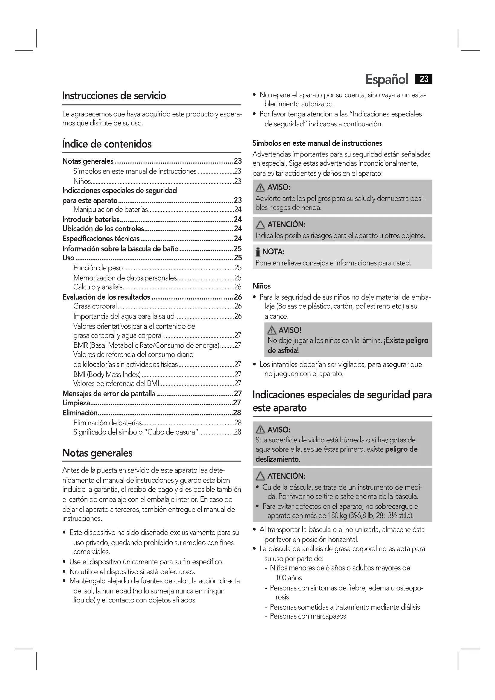 - Información sobre la báscula de baño p. 25