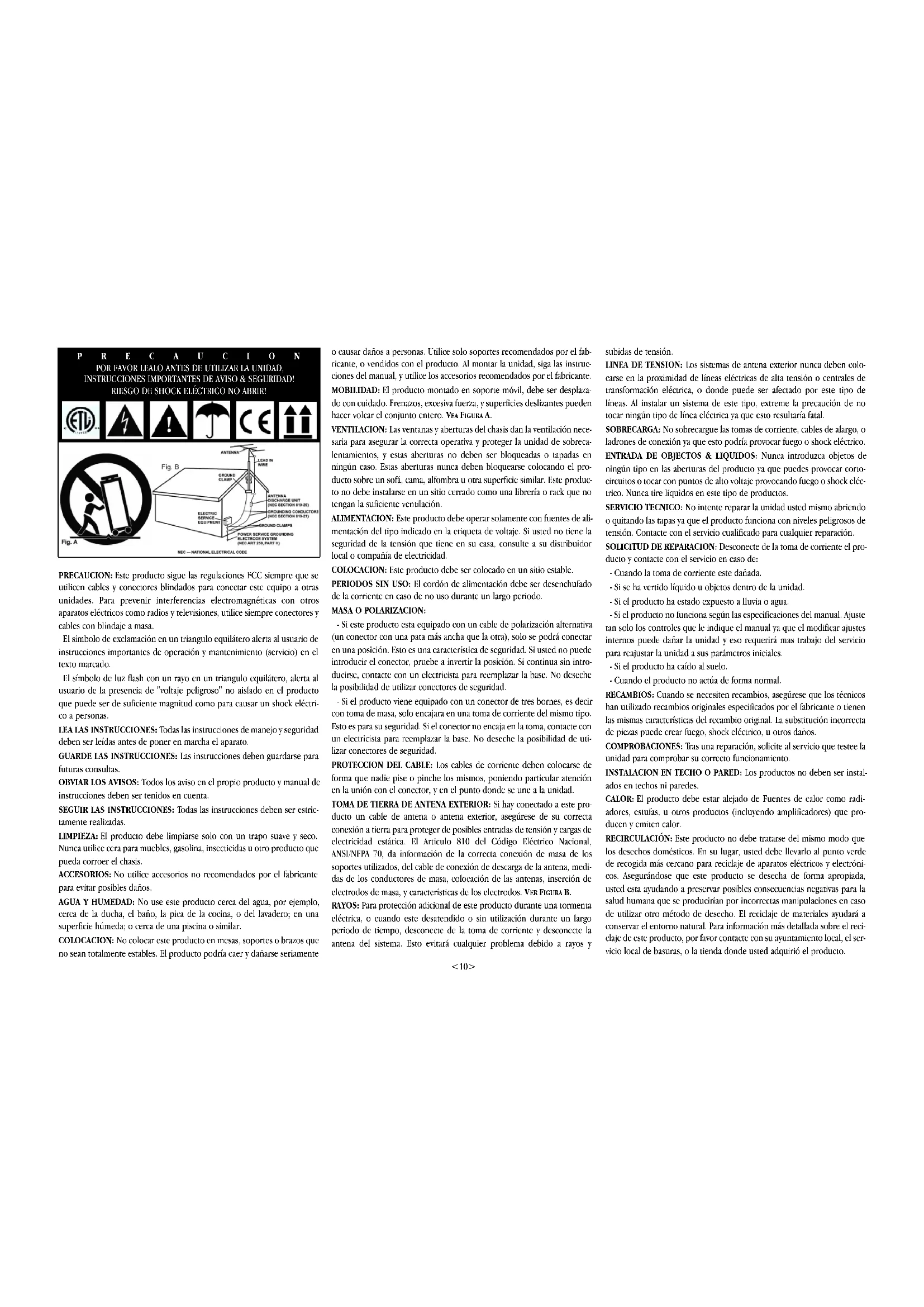 <9> XTR-500PRECAUCION: Este producto sigue las regulaciones FCC siempre que se utilicen cables y conectores blindados para conectar este equipo a otras unidades. Para prevenir interferencias electromagnéticas con otros aparatos eléctricos como radios y televisiones, utilice siempre conectores y cables con blindaje a masa. El símbolo de exclamación en un triangulo equilátero alerta al usuario de instrucciones importantes de operación y mantenimiento (servicio) en el texto marcado. El símbolo de luz flash con un rayo en un triangulo equilátero, alerta al usuario de la presencia de "voltaje peligroso" no aislado en el producto que puede ser de suficiente magnitud como para causar un shock eléctri- co a personas. LEA LAS INSTRUCCIONES: Todas las instrucciones de manejo y seguridad deben ser leídas antes de poner en marcha el aparato. GUARDE LAS INSTRUCCIONES: Las instrucciones deben guardarse para futuras consultas. OBVIAR LOS AVISOS: Todos los aviso en el propio producto y manual de instrucciones deben ser tenidos en cuenta. SEGUIR LAS INSTRUCCIONES: Todas las instrucciones deben ser estric- tamente realizadas. LIMPIEZA: El producto debe limpiarse solo con un trapo suave y seco. Nunca utilice cera para muebles, gasolina, insecticidas u otro producto que pueda corroer el chasis. ACCESORIOS: No utilice accesorios no recomendados por el fabricante para evitar posibles daños. AGUA Y HUMEDAD: No use este producto cerca del agua, por ejemplo, cerca de la ducha, el baño, la pica de la cocina, o del lavadero; en una superficie húmeda; o cerca de una piscina o similar. COLOCACION: No colocar este producto en mesas, soportes o brazos que no sean totalmente estables. El producto podría caer y dañarse seriamente o causar daños a personas. Utilice solo soportes recomendados por el fab- ricante, o vendidos con el producto. Al montar la unidad, siga las instruc- ciones del manual, y utilice los accesorios recomendados por el fabricante. MOBILIDAD: El producto montado en soporte móvil, debe ser desplaza- do con cuidado. Frenazos, excesiva fuerza, y superficies deslizantes pueden hacer volcar el conjunto entero. V EA FIGURA A. VENTILACION: Las ventanas y aberturas del chasis dan la ventilación nece- saria para asegurar la correcta operativa y proteger la unidad de sobreca- lentamientos, y estas aberturas no deben ser bloqueadas o tapadas en ningún caso. Estas aberturas nunca deben bloquearse colocando el pro- ducto sobre un sofá, cama, alfombra u otra superficie similar. Este produc- to no debe instalarse en un sitio cerrado como una librería o rack que no tengan la suficiente ventilación. ALIMENTACION: Este producto debe operar solamente con fuentes de ali- mentación del tipo indicado en la etiqueta de voltaje. Si usted no tiene la seguridad de la tensión que tiene en su casa, consulte a su distribuidor local o compañía de electricidad. COLOCACION: Este producto debe ser colocado en un sitio estable. PERIODOS SIN USO: El cordón de alimentación debe ser desenchufado de la corriente en caso de no uso durante un largo periodo. MASA O POLARIZACION: - Si este producto esta equipado con un cable de polarización alternativa (un conector con una pata más ancha que la otra), solo se podrá conectar en una posición. Esto es una característica de seguridad. Si usted no puede introducir el conector, pruebe a invertir la posición. Si continua sin intro- ducirse, contacte con un electricista para reemplazar la base. No deseche la posibilidad de utilizar conectores de seguridad. - Si el producto viene equipado con un conector de tres bornes, es decir con toma de masa, solo encajara en una toma de corriente del mismo tipo. Esto es para su seguridad. Si el conector no encaja en la toma, contacte con un electricista para reemplazar la base. No deseche la posibilidad de uti- lizar conectores de seguridad. PROTECCION DEL CABLE: Los cables de corriente deben colocarse de forma que nadie pise o pinche los mismos, poniendo particular atención en la unión con el conector, y en el punto donde se une a la unidad. TOMA DE TIERRA DE ANTENA EXTERIOR: Si hay conectado a este pro- ducto un cable de antena o antena exterior, asegúrese de su correcta conexión a tierra para proteger de posibles entradas de tensión y cargas de electricidad estática. El Articulo 810 del Código Eléctrico Nacional, ANSI/NFPA 70, da información de la correcta conexión de masa de los soportes utilizados, del cable de conexión de descarga de la antena, medi- das de los conductores de masa, colocación de las antenas, inserción de electrodos de masa, y características de los electrodos. V ER FIGURA B. RAYOS: Para protección adicional de este producto durante una tormenta eléctrica, o cuando este desatendido o sin utilización durante un largo periodo de tiempo, desconecte de la toma de corriente y desconecte la antena del sistema. Esto evitará cualquier problema debido a rayos y subidas de tensión. LINEA DE TENSION: Los sistemas de antena exterior nunca deben colo- carse en la proximidad de líneas eléctricas de alta tensión o centrales de transformación eléctrica, o donde puede ser afectado por este tipo de líneas. Al instalar un sistema de este tipo, extreme la precaución de no tocar ningún tipo de línea eléctrica ya que esto resultaría fatal. SOBRECARGA: No sobrecargue las tomas de corriente, cables de alargo, o ladrones de conexión ya que esto podría provocar fuego o shock eléctrico. ENTRADA DE OBJECTOS & LIQUIDOS: Nunca introduzca objetos de ningún tipo en las aberturas del producto ya que puedes provocar corto- circuitos o tocar con puntos de alto voltaje provocando fuego o shock eléc- trico. Nunca tire líquidos en este tipo de productos. SERVICIO TECNICO: No intente reparar la unidad usted mismo abriendo o quitando las tapas ya que el producto funciona con niveles peligrosos de tensión. Contacte con el servicio cualificado para cualquier reparación. SOLICITUD DE REPARACION: Desconecte de la