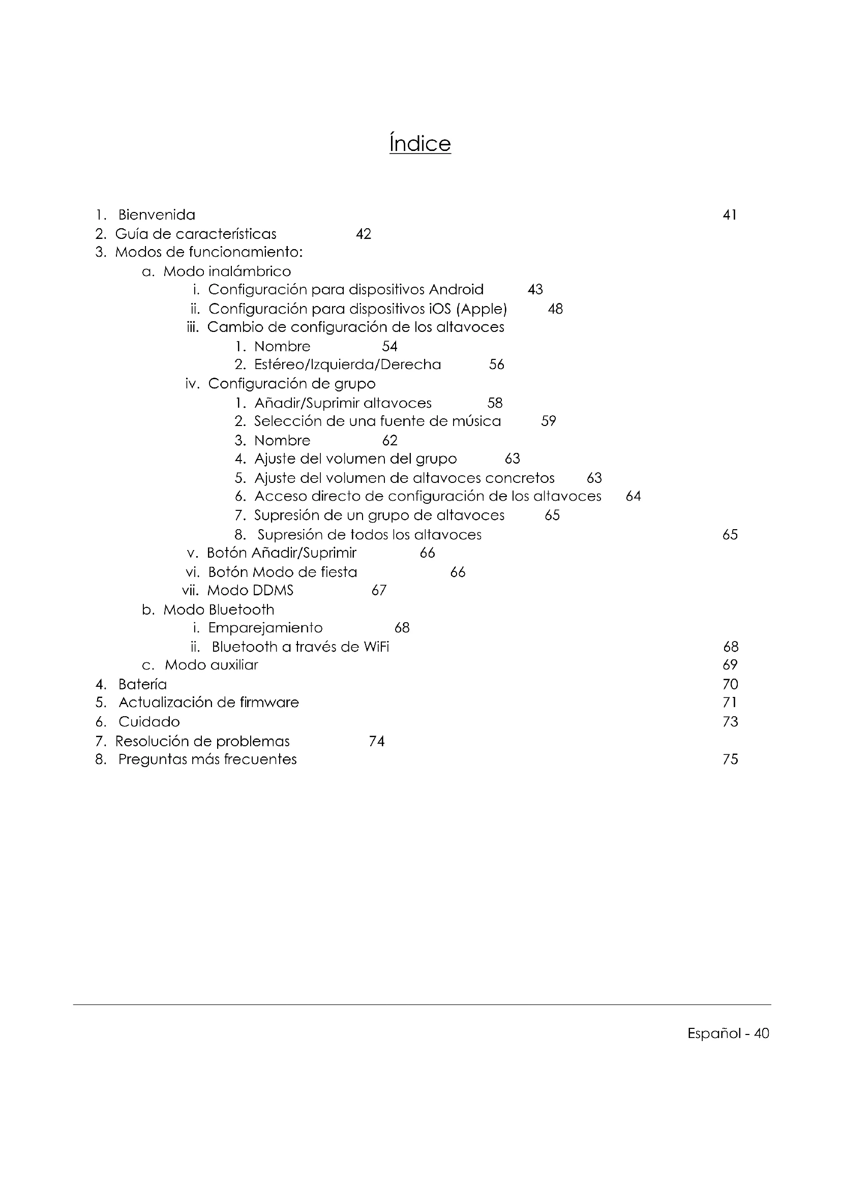 8. Preguntas más frecuentes 75__________________________________________________________________________________________________ Español - 41 Bienvenida ¡Enhorabuena por su adquisición! ART by Tivoli Audio mezcla un diseño clásico con la tecnología más avanzada para crear una solución sencilla de audio inalámbrico para el hogar. Alojada en una carcasa de madera que la convierte en un elemento del mobiliario y acabada con una rejilla de tela Gabriel® de alta calidad, esta colección supone un nuevo hito en la línea de productos Tivoli Audio en cuanto a trabajo artesanal y tecnología. Estos altavoces inalámbricos compatibles con Bluetooth® admiten varias configuraciones que le permitirán adaptar la reproducción a sus preferencias. Tanto si se trata de un solo altavoz que reproduce Spotify en la cocina, de un par estéreo en su salón o de una lista de reproducción para amenizar una fiesta en toda la casa, los altavoces ART by Tivoli Audio ofrecen soluciones sencillas y flexibles para una adaptación óptima al entorno, y mejoran su mundo a través de la música. Comience con uno y descubra lo sencillo que es integrarlo y adaptarlo a los diferentes estilos de sus habitaciones. Sabemos que está impaciente por comenzar a disfrutar de su nueva adquisición, pero para poder aprovechar todo de lo que es capaz, le rogamos que dedique un momento a leer este manual del propietario y las instrucciones de seguridad. Si tiene alguna pregunta, no dude en contactar con su distribuidor Tivoli Audio. Por favor, conserve el embalaje original por si tuviera que enviar su radio. Embalado junto con su Cube encontrará: (1) Fuente de alimentación externa y enchufes Por favor, contacte con su distribuidor Tivoli Audio si falta alguno de estos elementos.__________________________________________________________________________________________________ Español - 42 Guía de características LOGO de Tivoli Audio: se trata de un control táctil capacitivo situado bajo la madera. En modo inalámbrico, pondrá en pausa/reproducirá la transmisión de música. En modo Bluetooth, silenciará el altavoz. ENCENDIDO: pulse para encender la unidad. Manténgalo pulsado para apagar. SETUP (configuración): pulse para habilitar su altavoz a fin de conectarlo a su red doméstica PARTY MODE (modo de fiesta): manténgalo pulsado para enviar la música desde este altavoz a todos los altavoces conectados. Más información en la sección «Modo de fiesta» de este manual. ADD/DROP (añadir/suprimir): si el altavoz está conectado a un grupo, mantener pulsado este botón lo elimina del grupo. Si el altavoz no está conectado a un grupo, pulsar este botón lo conecta al siguiente grupo disponible. Más información en la sección «Añadir/Suprimir» de este manual. SOURCE (fuente): Tóquelo para cambiar entre fuentes de audio. La fuente de audio se indica mediante el color del LED. Si está en modo Bluetooth, mantenga pulsado este botón durante un segundo si ya está parpadeando o, si está iluminado permanentemente, hasta que empiece a parpadear para permitir el modo de emparejamiento. LED de color verde – modo inalámbrico LED de color azul – modo de transmisión por Bluetooth LED de color morado – modo auxiliar VOLUMEN -: pulse para bajar el volumen. VOLUMEN +: pulse para subir el volumen. Alimentación CC: conecte su adaptador de corriente Tivoli para cargar la batería o suministrar energía a su altavoz. Utilice solamente el suministro de corriente proporcionado con este producto. Si el suministro de corriente resulta dañado o se extravía, utilice exclusivamente un repuesto igual. Cualquier adaptador de CC deberá indicar 15 V CC 1500 mA. AUX: Conecte música directamente para una experiencia única. Service: puerto de servicio. Para ser utilizado exclusivamente por el centro del servicio autorizado Tivoli__________________________________________________________________________________________________ Español - 43 Modo inalámbrico Configuración para dispositivos Android Antes de configurar su nuevo altavoz inalámbrico, necesitará descargar la aplicación Tivoli Audio Wireless para controlar sus altavoces. La aplicación está disponible en las tiendas Google Play Store y Apple App Store.