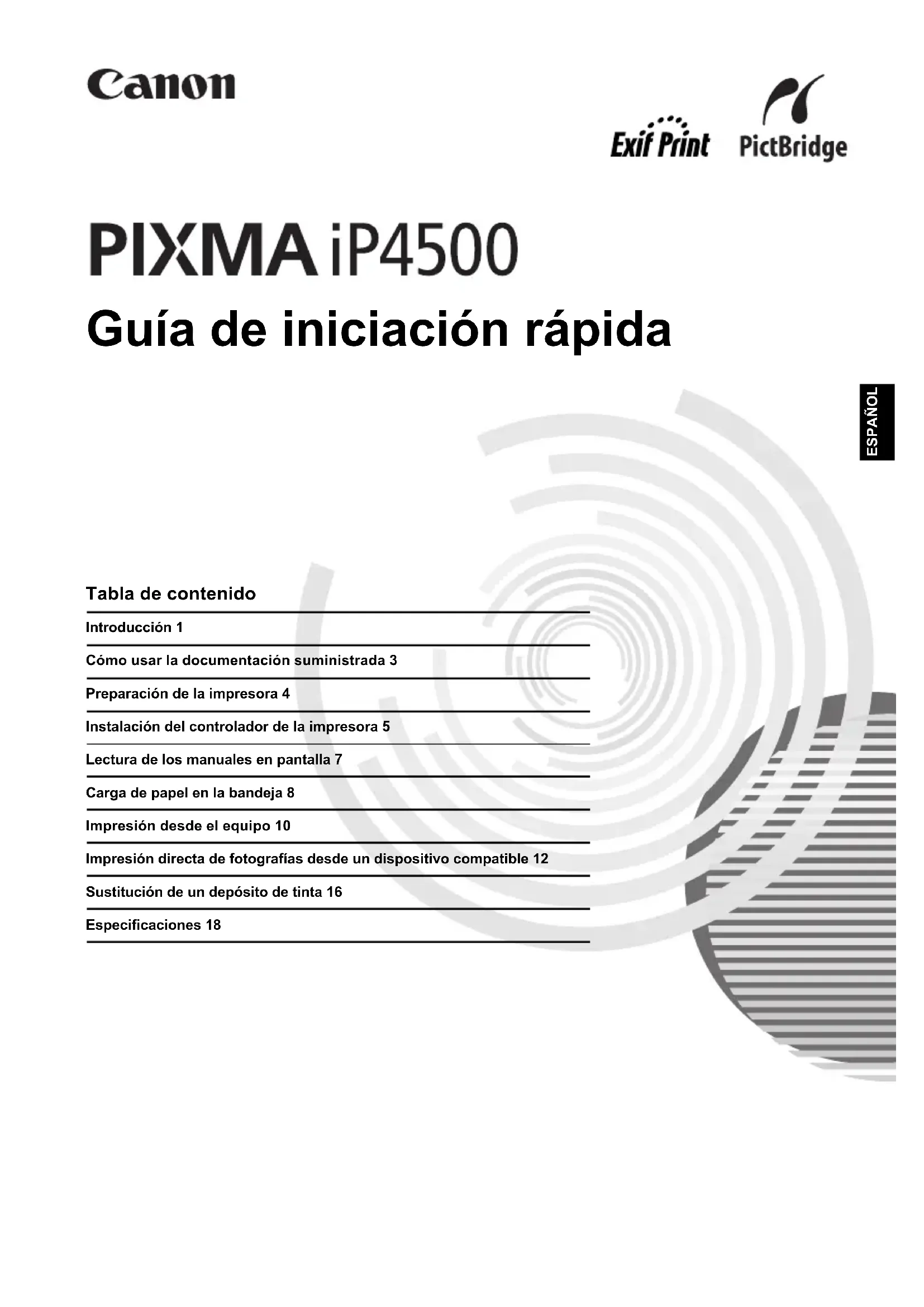 de eficiencia energética. Requisitos de alimentación Asegúrese de utilizar el cable de alimentación que se incluye con la impresora. Utilice exclusivamente el suministro eléctrico del país de adquisición. El uso de un voltaje incorrecto podría provocar un incendio o una descarga eléctrica. El voltaje y la frecuencia correctos son:100-240 V de CA, 50/60 Hz Acerca de los consumibles Los consumibles, como los depósitos de tinta y los cartuchos FINE (FINE Cartridges), estarán disponibles durante 5 años después de que finalice su fabricación. Precauciones de seguridad Advertencia z Este producto emite flujo magnético de bajo nivel. Si utiliza un marcapasos cardíaco y detecta anomalías, aléjese de este producto y consulte a su médico. z Nunca intente conectar el cable de alimentación a la toma de corriente ni intente desconectar el cable de alimentación si tiene las manos húmedas. z No dañe, modifique, estire, retuerza o doble excesivamente el cable de alimentación eléctrica. No coloque objetos pesados sobre el cable. z No utilice un voltaje diferente al del país de compra. El uso de un voltaje y una frecuencia incorrectos podría provocar un incendio o una descarga eléctrica.z Introduzca el enchufe de la impresora en la toma de corriente hasta que haga tope. Precaución z Por razones de seguridad, almacene los depósitos de tinta fuera del alcance de los niños. z No deje caer ni agite los depósitos de tinta ya que la tinta puede gotear y manchar la ropa y las manos. Lea también las Precauciones de seguridad del manual en pantalla Guía del Usuario. Tenga en cuenta los mensajes de advertencia y precaución con el fin de evitar daños tanto al usuario como a la impresora.3Cómo usar la documentación suministrada ESPAÑOL Cómo usar la documentación suministrada Documentación impresa Instrucciones de instalación Asegúrese de leer esta hoja en primer lugar. Esta hoja incluye instrucciones para la instalación de la impresora y la puesta a punto para su uso. Guía de iniciación rápida (esta guía) Lea esta guía cuando vaya a empezar a utilizar la impresora. Después de seguir las instrucciones de instalación, recomendamos que lea esta guía para familiarizarse con las operaciones básicas, por ejemplo, la impresión desde su equipo y un dispositivo compatible con PictBridge. Manuales en pantalla Guía del Usuario Lea esta guía cuando vaya a empezar a utilizar la impresora. Si la Guía de iniciación rápida no le ofrece información suficiente, consulte la Guía del Usuario, que puede instalar desde el [Setup CD-ROM/CD-ROM de instalación]. Esta guía contiene instrucciones detalladas para: z soportes de impresión z imprimir desde el equipo z mantenimiento z solución de problemas También hay disponibles otras guías para las funciones avanzadas. Guía de impresión para PC Consulte esta guía para obtener instrucciones completas sobre la configuración del controlador de la impresora. Guía de impresión fotográfica para PC (sólo Windows