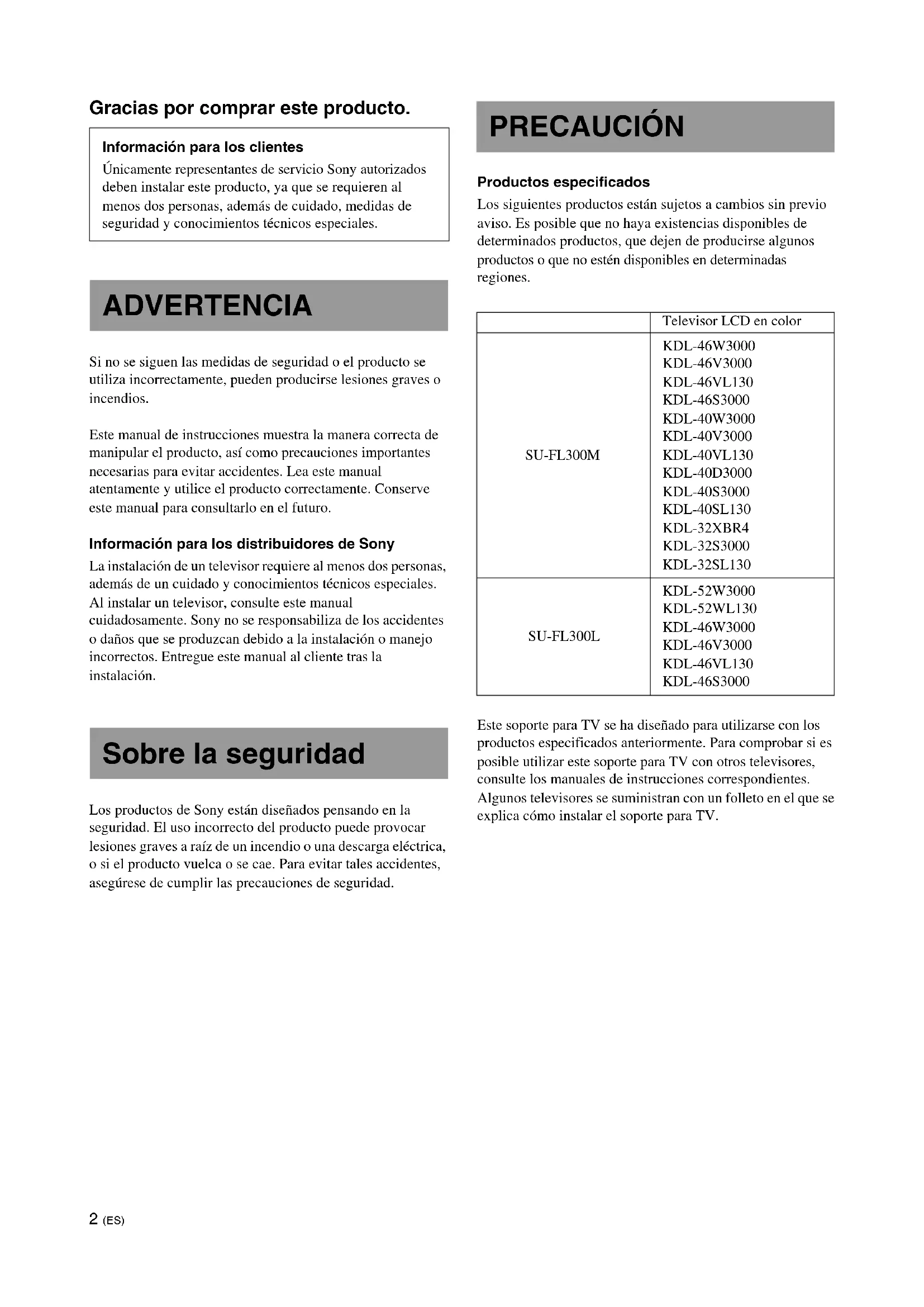 Suspendez l’enceinte centrale sur les vis des crochets, comme illustré. Crochet d’enceinte Vis (+P4 × 15)Crochet d’enceinte SS-CT71/CNP2200 SS-CT72/CT74 Vis (+P4 × 15)Enceinte centrale2 (ES) Gracias por comprar este producto. Si no se siguen las medidas de seguridad o el producto se utiliza incorrectamente, pueden producirse lesiones graves o incendios. Este manual de instrucciones muestra la manera correcta de manipular el producto, así como precauciones importantes necesarias para evitar accidentes. Lea este manual atentamente y utilice el producto correctamente. Conserve este manual para consultarlo en el futuro. Información para los distribuidores de Sony La instalación de un televisor requiere al menos dos personas, además de un cuidado y conocimientos técnicos especiales. Al instalar un televisor, consulte este manual cuidadosamente. Sony no se responsabiliza de los accidentes o daños que se produzcan debido a la instalación o manejo incorrectos. Entregue este manual al cliente tras la instalación. Los productos de Sony están diseñados pensando en la seguridad. El uso incorrecto del producto puede provocar lesiones graves a raíz de un incendio o una descarga eléctrica, o si el producto vuelca o se cae. Para evitar tales accidentes, asegúrese de cumplir las precauciones de seguridad. Productos especificados Los siguientes productos están sujetos a cambios sin previo aviso. Es posible que no haya existencias disponibles de determinados productos, que dejen de producirse algunos productos o que no estén disponibles en determinadas regiones. Este soporte para TV se ha diseñado para utilizarse con los productos especificados anteriormente. Para comprobar si es posible utilizar este soporte para TV con otros televisores, consulte los manuales de instrucciones correspondientes. Algunos televisores se suministran con un folleto en el que se explica cómo instalar el soporte para TV. Información para los clientes Únicamente representantes de servicio Sony autorizados deben instalar este producto, ya que se requieren al menos dos personas, además de cuidado, medidas de seguridad y conocimientos técnicos especiales. ADVERTENCIA Sobre la seguridad PRECAUCIÓN Televisor LCD en color SU-FL300M KDL-46W3000 KDL-46V3000 KDL-46VL130 KDL-46S3000 KDL-40W3000 KDL-40V3000 KDL-40VL130 KDL-40D3000 KDL-40S3000 KDL-40SL130 KDL-32XBR4 KDL-32S3000 KDL-32SL130 SU-FL300L KDL-52W3000 KDL-52WL130 KDL-46W3000 KDL-46V3000 KDL-46VL130 KDL-46S30003 (ES) Únicamente representantes de servicio Sony autorizados deben instalar los productos. El televisor y el soporte para TV son muy pesados; por tanto, si alguna persona no cualificada intenta llevar a cabo la instalación, podría sufrir alguna lesión. Tome las debidas precauciones para evitar que el soporte para TV se vuelque. De lo contrario, el televisor podría volcarse y provocar lesiones. Fije el televisor a una pared, etc., para evitar que se vuelque. Asegúrese de instalar el soporte para TV en una superficie plana y sólida. No instale el soporte para TV de modo que se incline en cualquier dirección. En caso contrario, el soporte para TV podría volcarse o el televisor podría caer. Esto podría provocar lesiones o daños. Si instala el soporte para TV en una superficie blanda, como un tapete o una alfombra, cubra primero dicha zona con un panel. No utilice un soporte para TV dañado. No se apoye en el televisor ni se cuelgue de él. Podría volcarse el soporte para TV o caerse el televisor y provocar lesiones graves o la muerte. No permita que los niños se suban en el soporte para TV ni que gateen por las repisas. Si se suben niños encima del soporte para TV o gatean entre las repisas, el cristal podría romperse y el soporte para TV volcarse, provocando lesiones graves o la muerte. No se suba al soporte para TV. Podría caerse, o romper el cristal y provocar lesiones. No cubra los orificios de ventilación del televisor. Si se cubren los orificios de ventilación (con un paño, etc.), el monitor podría sobrecalentarse y provocar un incendio. Procure evitar que se aplaste el cable de alimentación o el cable de conexión.