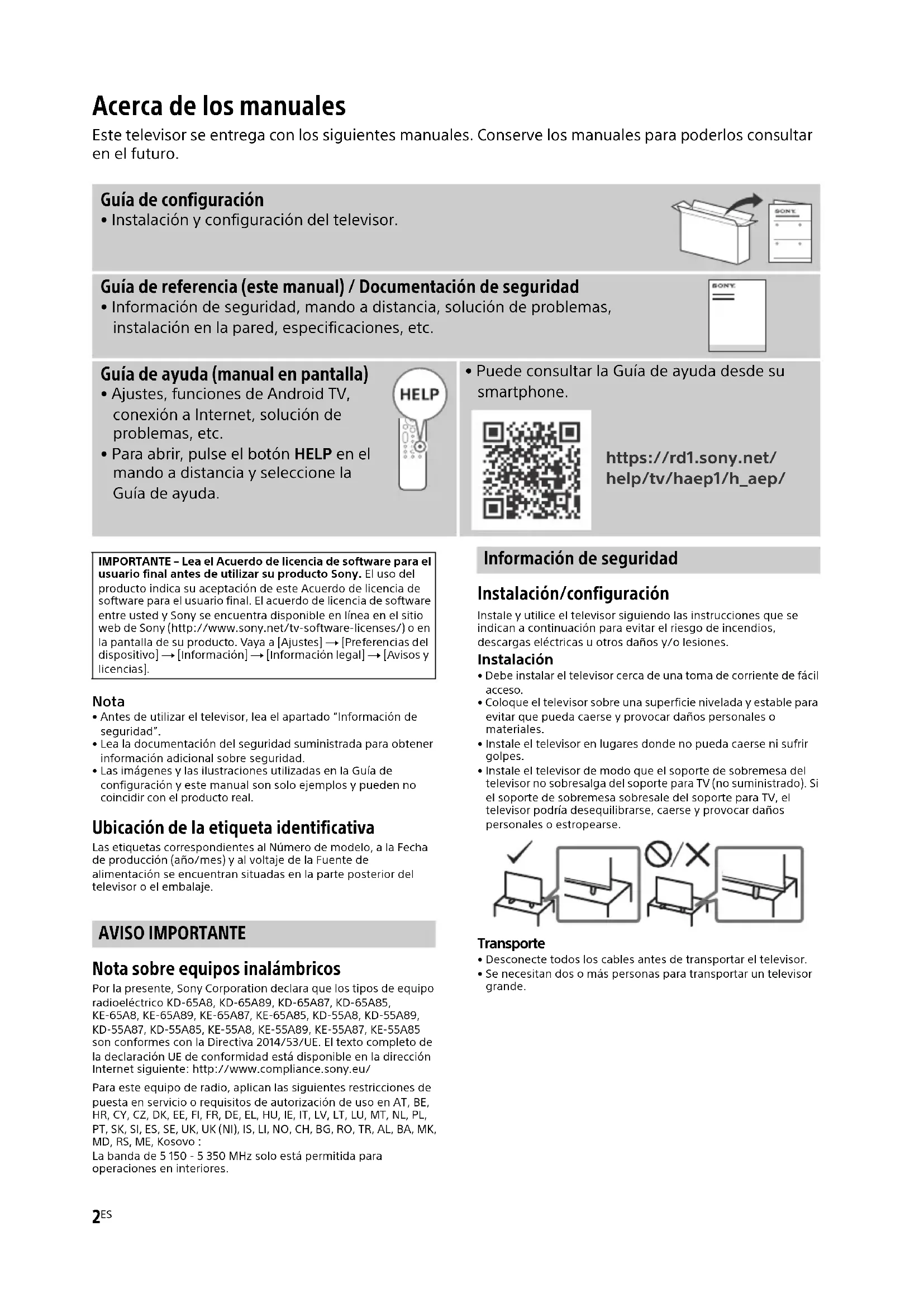 - Puede consultar la Guía de ayuda desde su smartphone. https://rd1.sony.net/ help/tv/haep1/h_aep/ IMPORTANTE – Lea el Acuerdo de licencia de software para el usuario final antes de utilizar su producto Sony. El uso del producto indica su aceptación de este Acuerdo de licencia de software para el usuario final. El acuerdo de licencia de software entre usted y Sony se encuentra disponible en línea en el sitio web de Sony (http://www.sony.net/tv-software-licenses/) o en la pantalla de su producto. Vaya a [Ajustes] t [Preferencias del dispositivo] t [Información] t [Información legal] t [Avisos y licencias].D:\_SONY TV\NC\SY20_NC_EU_RG_131\5014780131\03ES\5014780131_03ES.fm master page: Right KD-65A8 / 65A89 / 65A87 / 65A85 / 55A8 / 55A89 / 55A87 / 55A85 / KE-65A8 / 65A89 / 65A87 / 65A85 / 55A8 / 55A89 / 55A87 / 55A85 5-014-780-13(1)