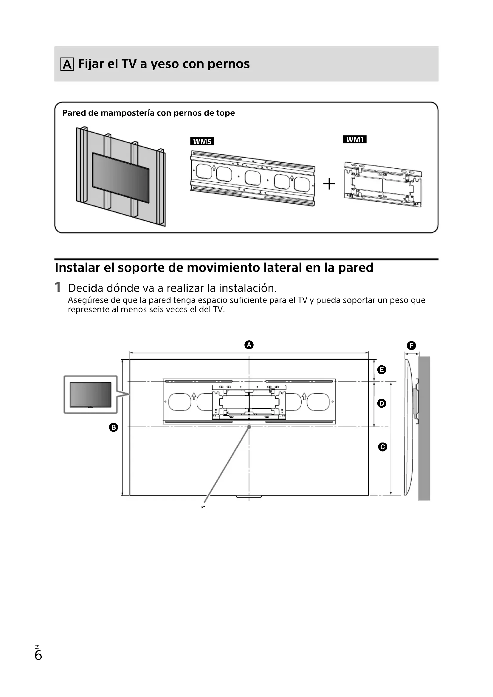 WM1 Instalar el soporte de movimiento lateral en la pared 1 Decida dónde va a realizar la instalación. Asegúrese de que la pared tenga espacio suficiente para el TV y pueda soportar un peso que represente al menos seis veces el del TV.