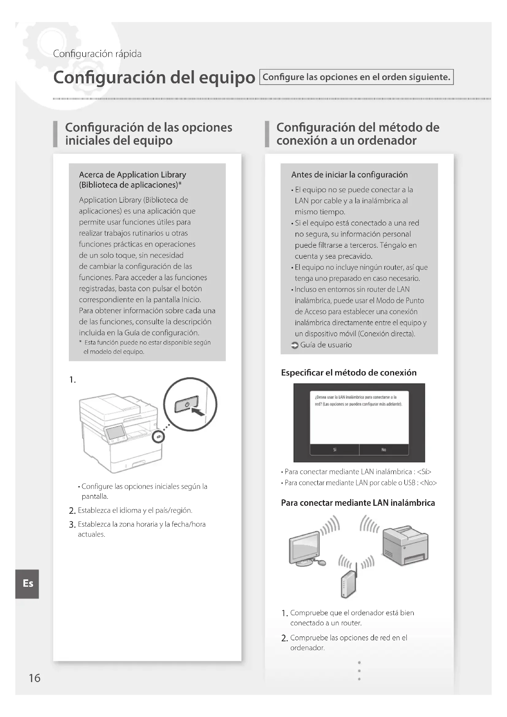 - Configure las opciones iniciales según la pantalla. Establezca el idioma y el país/región. Establezca la zona horaria y la fecha/hora actuales.Antes de iniciar la configuración• El equipo no se puede conectar a la LAN por cable y a la inalámbrica al mismo tiempo.• Si el equipo está conectado a una red no segura, su información personal puede filtrarse a terceros. Téngalo en cuenta y sea precavido. El equipo no incluye ningún router, así que tenga uno preparado en caso necesario. Incluso en entornos sin router de LAN inalámbrica, puede usar el Modo de Punto de Acceso para establecer una conexión inalámbrica directamente entre el equipo y un dispositivo móvil (Conexión directa). Guía de usuarioEspecicar el método de conexión• Para conectar mediante LAN inalámbrica : <Sí> Para conectar mediante LAN por cable o USB : <No>Para conectar mediante LAN inalámbrica Compruebe que el ordenador está bien conectado a un router. Compruebe las opciones de red en el ordenador.