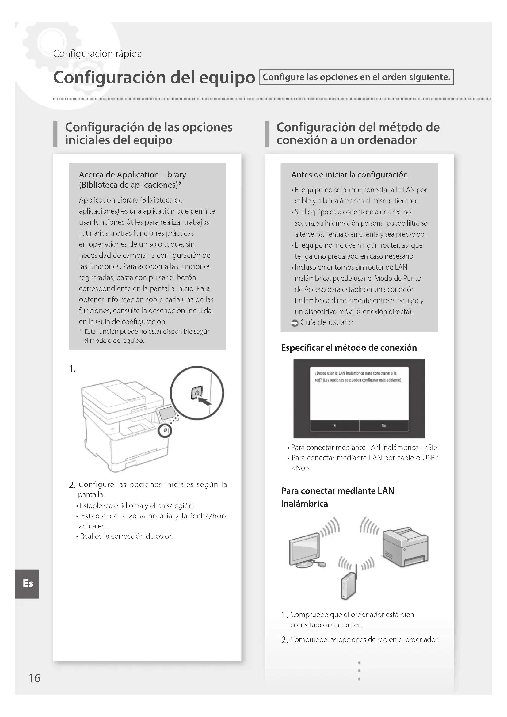 Configuration des réglages de fax Configuration rapide FrConfiguración del método de conexión a un ordenador Acerca de Application Library (Biblioteca de aplicaciones)* Application Library (Biblioteca de aplicaciones) es una aplicación que permite usar funciones útiles para realizar trabajos rutinarios u otras funciones prácticas en operaciones de un solo toque, sin necesidad de cambiar la configuración de las funciones. Para acceder a las funciones registradas, basta con pulsar el botón correspondiente en la pantalla Inicio. Para obtener información sobre cada una de las funciones, consulte la descripción incluida en la Guía de configuración.* Esta función puede no estar disponible según el modelo del equipo.