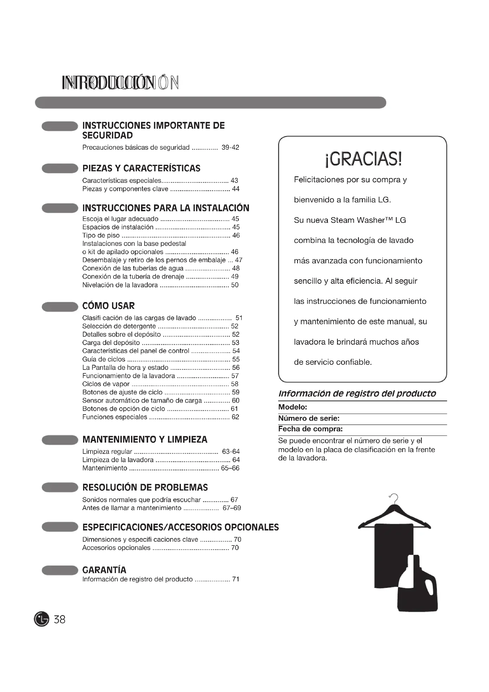Felicitaciones por su compra y bienvenido a la familia LG. Su nueva Steam Washer™ LG combina la tecnología de lavado más avanzada con funcionamiento sencillo y alta eficiencia. Al seguir las instrucciones de funcionamiento y mantenimiento de este manual, su lavadora le brindará muchos años de servicio confiable. ¡GRACIAS! Información de registro del producto Modelo:Número de serie:Fecha de compra:Se puede encontrar el número de serie y el modelo en la placa de clasificación en la frente de la lavadora. 38I N S T RU C C I O N E S I M P O RTA N T E D E S E G U R I DA D Su Seguridad y la de los demás son de suma importancia. En este manual y en su electrodoméstico figuran muchos mensajes importantes de seguridad. Lea y cumpla siempre con todos los mensajes de seguridad.Éste es el símbolo de alerta de seguridad.El mismo alerta sobre potenciales riesgos de muerte o heridas tanto para usted como para otras personas.Todos los mensajes de seguridad estarán a continuación del símbolo de alerta de seguridad y con la palabra PELIGRO o ADVERTENCIA. Estas palabras significan: wPELIGRO: Corre riesgo de muerte o de sufrir heridas serias si no sigue las instrucciones inmediatamente. wADVERTENCIA: Corre riesgo de muerte o de sufrir heridas serias si no sigue las instrucciones.Todos los mensajes de seguridad le indicarán cuál es el riesgo potencial, le dirán cómo reducir las posibilidades de sufrir heridas y qué puede suceder si no se siguen las instrucciones. wADVERTENCIA Por su seguridad, debe seguir la información indicada en este manual para minimizar el riesgo de incendio o explosión, descarga eléctrica, o para prevenir daños a la propiedad, lesiones personales o muerte. LEA TODAS LA INSTRUCCIONES ANTES DE USAR 39wADVERTENCIA Por su seguridad, debe seguir la información indicada en este manual para minimizar el riesgo de incendio o explosión, descarga eléctrica, o para prevenir daños a la propiedad, lesiones personales o muerte. LEA TODAS LA INSTRUCCIONES ANTES DE USAR INSTRUCCIONES BáSICaS dE SEgURIdad wADVERTENCIA Para minimizar el riesgo de incendio o explosión, descarga eléctrica, o para prevenir lesiones personales cuando use electrodomésticos, se deben seguir precauciones básicas de seguridad, incluyendo las siguientes: I N S T RU C C I O N E S I M P O RTA N T E D E S E G U R I DA D