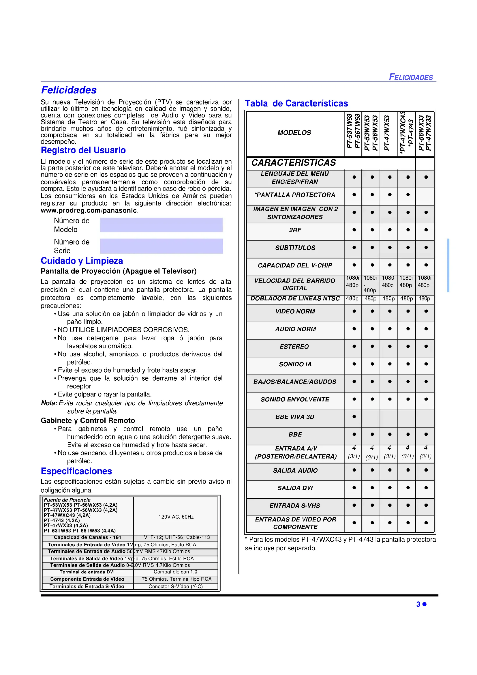 - Indice Nota: La Información acerca de la garantía y centro de servicio se encuentra al final de este manual.FELICIDADES 3 l Felicidades Su nueva Televisión de Proyección (PTV) se caracteriza por utilizar lo último en tecnología en calidad de imagen y sonido, cuenta con conexiones completas de Audio y Video para su Sistema de Teatro en Casa. Su televisión esta diseñada para brindarle muchos años de entretenimiento, fué sintonizada y comprobada en su totalidad en la fábrica para su mejor desempeño. Registro del Usuario El modelo y el número de serie de este producto se localizan en la parte posterior de este televisor. Deberá anotar el modelo y el número de serie en los espacios que se proveen a continuación y consérvelos permanentemente como comprobación de su compra. Esto le ayudará a identificarlo en caso de robo ó pérdida. Los consumidores en los Estados Unidos de América pueden registrar su producto en la siguiente dirección electrónica: www.prodreg.com/panasonic. Número de Modelo Número de Serie Cuidado y Limpieza Pantalla de Proyección (Apague el Televisor) La pantalla de proyección es un sistema de lentes de alta precisión el cual contiene una pantalla protectora. La pantalla protectora es completamente lavable, con las siguientes precauciones: p. 29