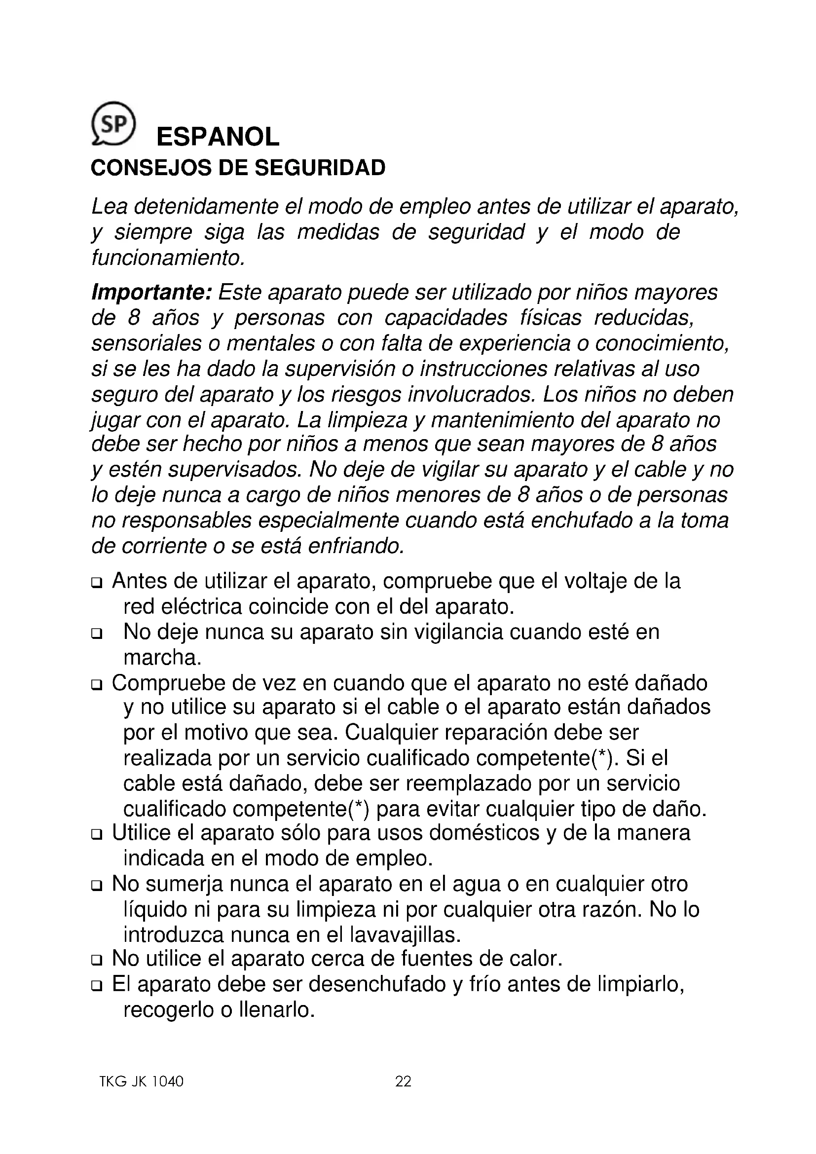 Lea detenidamente el modo de empleo antes de utilizar el aparato, y siempre siga las medidas de seguridad y el modo de funcionamiento. Importante: Este aparato puede ser utilizado por niños mayores de 8 años y personas con capacidades físicas reducidas, sensoriales o mentales o con falta de experiencia o conocimiento, si se les ha dado la supervisión o instrucciones relativas al uso seguro del aparato y los riesgos involucrados. Los niños no deben jugar con el aparato. La limpieza y mantenimiento del aparato no debe ser hecho por niños a menos que sean mayores de 8 años y estén supervisados. No deje de vigilar su aparato y el cable y no lo deje nunca a cargo de niños menores de 8 años o de personas no responsables especialmente cuando está enchufado a la toma de corriente o se está enfriando. ❑ Antes de utilizar el aparato, compruebe que el voltaje de la red eléctrica coincide con el del aparato. ❑ No deje nunca su aparato sin vigilancia cuando esté en marcha. ❑ Compruebe de vez en cuando que el aparato no esté dañado y no utilice su aparato si el cable o el aparato están dañados por el motivo que sea. Cualquier reparación debe ser realizada por un servicio cualificado competente(*). Si el cable está dañado, debe ser reemplazado por un servicio cualificado competente(*) para evitar cualquier tipo de daño. ❑ Utilice el aparato sólo para usos domésticos y de la manera indicada en el modo de empleo. ❑ No sumerja nunca el aparato en el agua o en cualquier otro líquido ni para su limpieza ni por cualquier otra razón. No lo introduzca nunca en el lavavajillas. ❑ No utilice el aparato cerca de fuentes de calor. ❑ El aparato debe ser desenchufado y frío antes de limpiarlo, recogerlo o llenarlo.23 TKG JK 1040