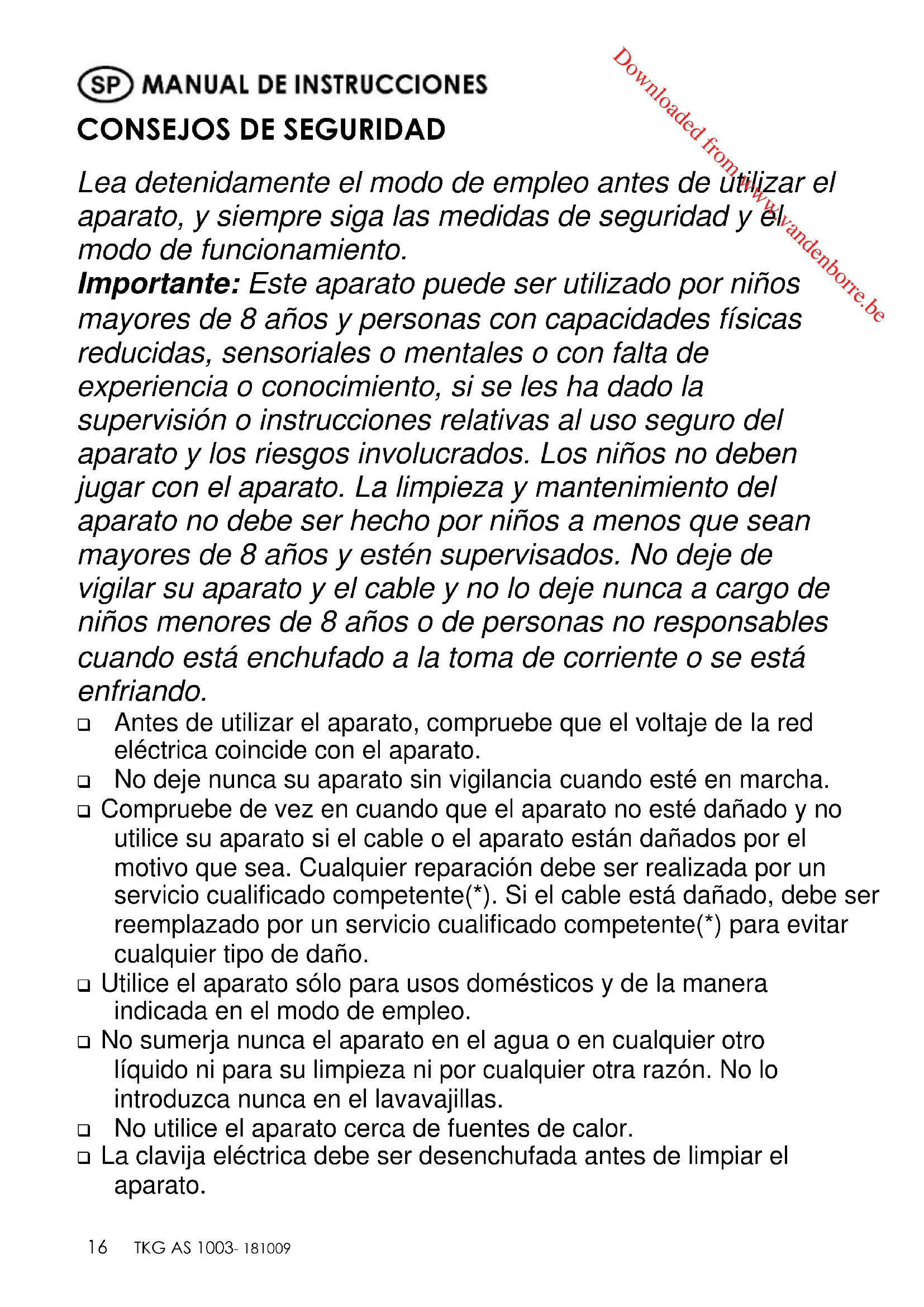 Lea detenidamente el modo de empleo antes de utilizar el aparato, y siempre siga las medidas de seguridad y el modo de funcionamiento. Importante: Este aparato puede ser utilizado por niños mayores de 8 años y personas con capacidades físicas reducidas, sensoriales o mentales o con falta de experiencia o conocimiento, si se les ha dado la supervisión o instrucciones relativas al uso seguro del aparato y los riesgos involucrados. Los niños no deben jugar con el aparato. La limpieza y mantenimiento del aparato no debe ser hecho por niños a menos que sean mayores de 8 años y estén supervisados. No deje de vigilar su aparato y el cable y no lo deje nunca a cargo de niños menores de 8 años o de personas no responsables cuando está enchufado a la toma de corriente o se está enfriando. ❑ Antes de utilizar el aparato, compruebe que el voltaje de la red eléctrica coincide con el aparato. ❑ No deje nunca su aparato sin vigilancia cuando esté en marcha. ❑ Compruebe de vez en cuando que el aparato no esté dañado y no utilice su aparato si el cable o el aparato están dañados por el motivo que sea. Cualquier reparación debe ser realizada por un servicio cualificado competente(*). Si el cable está dañado, debe ser reemplazado por un servicio cualificado competente(*) para evitar cualquier tipo de daño. ❑ Utilice el aparato sólo para usos domésticos y de la manera indicada en el modo de empleo. ❑ No sumerja nunca el aparato en el agua o en cualquier otro líquido ni para su limpieza ni por cualquier otra razón. No lo introduzca nunca en el lavavajillas. ❑ No utilice el aparato cerca de fuentes de calor. ❑ La clavija eléctrica debe ser desenchufada antes de limpiar el aparato. Downloaded from www.vandenborre.beCopies of the I/B. Please reproduce them without any changes except under special instruction from Team International BELGIUM. The pages must be reproduced and folded in order to obtain a booklet A5 (+/- 148.5 mm width x 210 mm height). When folding, make sure you keep the good numbering when you turn the pages of the I/B. Don’t change the page numbering. Keep the language integrity.