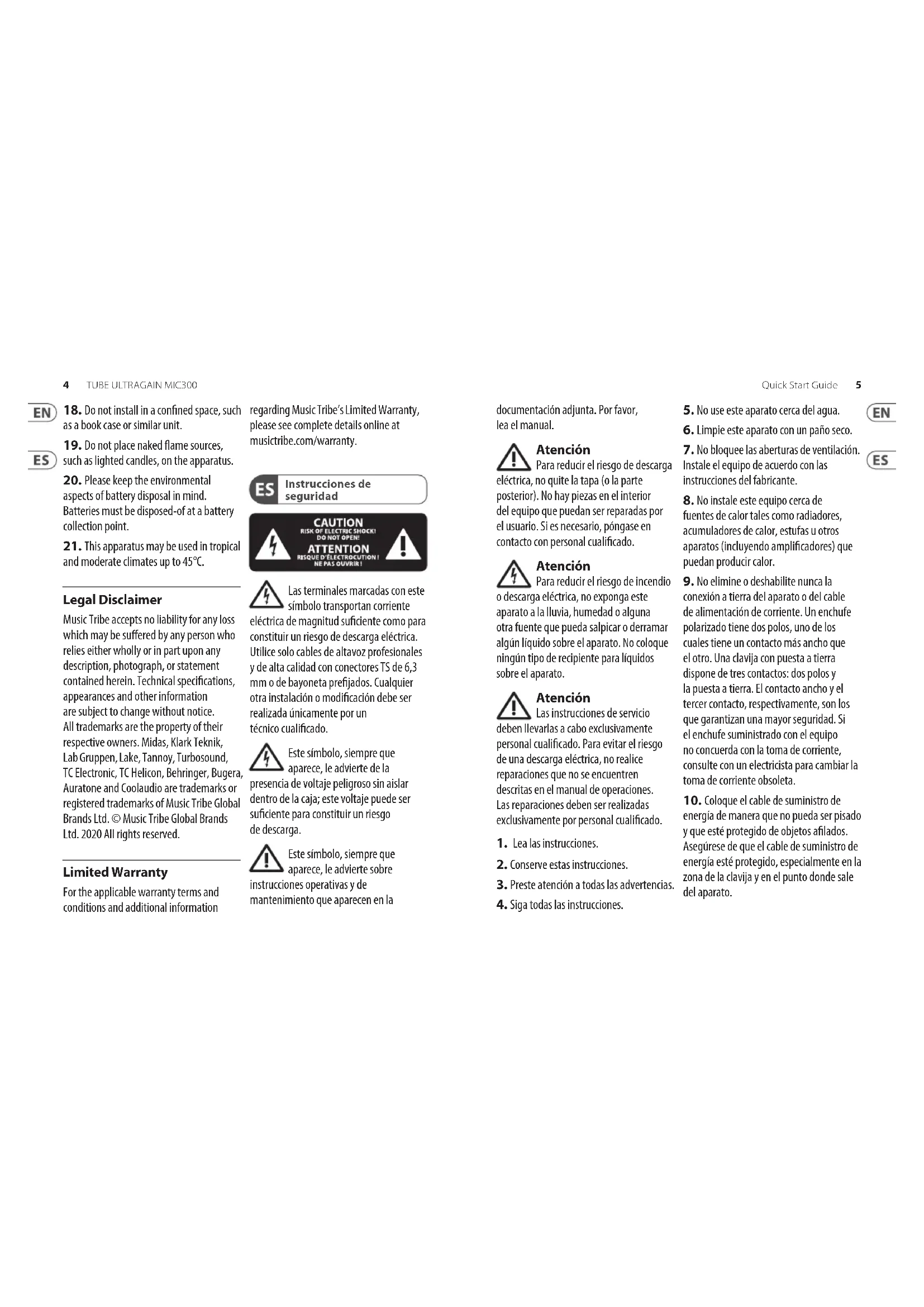 and moderate climates up to 45°C. Legal Disclaimer Music Tribe accepts no liability for any loss which may be suered by any person who relies either wholly or in part upon any description, photograph, or statement contained herein. Technical specications, appearances and other information are subject to change without notice. All trademarks are the property of their respective owners. Midas, Klark Teknik, Lab Gruppen, Lake, Tannoy, Turbosound, TC Electronic, TC Helicon, Behringer, Bugera, Auratone and Coolaudio are trademarks or registered trademarks of Music Tribe Global Brands Ltd. © Music Tribe Global Brands Ltd. 2020 All rights reserved. Limited Warranty For the applicable warranty terms and conditions and additional information regarding Music Tribe’s Limited Warranty, please see complete details online at musictribe.com/warranty. Las terminales marcadas con este símbolo transportan corriente eléctrica de magnitud suciente como para constituir un riesgo de descarga eléctrica. Utilicesolo cables de altavoz profesionales y de alta calidad con conectores TS de 6,3 mm o de bayoneta prejados. Cualquier otra instalación o modicación debe ser realizada únicamente por un técnicocualicado. Este símbolo, siempre que aparece, leadvierte de la presencia de voltaje peligroso sin aislar dentro de la caja; estevoltaje puede ser suciente para constituir un riesgo dedescarga. Este símbolo, siempre que aparece, leadvierte sobre instrucciones operativas y de mantenimiento que aparecen en la documentación adjunta. Por favor, leaelmanual. Atención Para reducir el riesgo de descarga eléctrica, no quite la tapa (olaparte posterior). Nohay piezas en el interior del equipo que puedan ser reparadas por el usuario. Sies necesario, póngase en contacto con personal cualicado. Atención Para reducir el riesgo de incendio o descarga eléctrica, no exponga este aparato a la lluvia, humedad o alguna otra fuente que pueda salpicar o derramar algún líquido sobre el aparato. Nocoloque ningún tipo de recipiente para líquidos sobre elaparato. Atención Las instrucciones de servicio deben llevarlas a cabo exclusivamente personal cualicado. Paraevitar el riesgo de una descarga eléctrica, no realice reparaciones que no se encuentren descritas en el manual de operaciones. Lasreparaciones deben ser realizadas exclusivamente por personalcualicado.