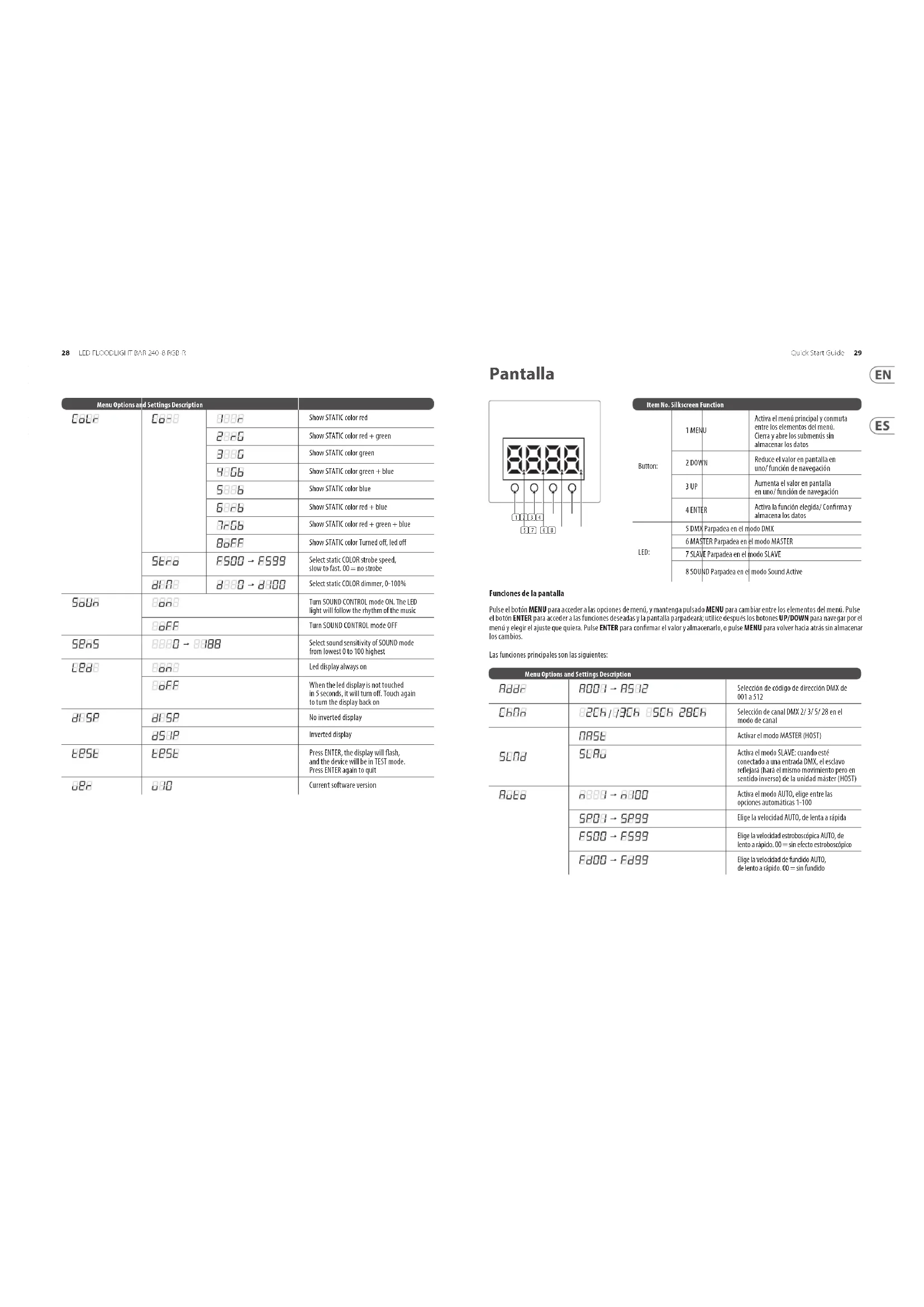 Selección de canal DMX 2/ 3/ 5/ 28 en el modo de canal Activar el modo MASTER (HOST) Activa el modo SLAVE: cuando esté conectado a una entrada DMX, el esclavo reejará (hará el mismo movimiento pero en sentido inverso) de la unidad máster (HOST) Activa el modo AUTO, elige entre las opciones automáticas 1-100 Elige la velocidad AUTO, de lenta a rápida Elige la velocidad estroboscópica AUTO, de lento a rápido. 00 = sin efecto estroboscópico Elige la velocidad de fundido AUTO, de lento a rápido. 00 = sin fundido Item No. Silkscreen Function Button: 1 MENU Activa el menú principal y conmuta entre los elementos del menú. Cierra y abre los submenús sin almacenar los datos 2 DOWN Reduce el valor en pantalla en uno/ función de navegación 3 UP Aumenta el valor en pantalla en uno/ función de navegación 4 ENTER Activa la función elegida/ Conrma y almacena los datos LED: 5 DMX Parpadea en el modo DMX 6 MASTER Parpadea en el modo MASTER 7 SLAVE Parpadea en el modo SLAVE 8 SOUND Parpadea en el modo Sound Active 28 29Quick Start GuideLED FLOODLIGHT BAR 240-8 RGB-R30 31Quick Start GuideLED FLOODLIGHT BAR 240-8 RGB-R Menu Options and Settings Description Activa el modo PROG, elige entre 00-21 shows de luces prejados Elige la velocidad PROG, de lento a rápido Elige la velocidad estroboscópica PROG, de lento a rápido. 00 = sin efecto estroboscópico Elige la velocidad de fundido PROG, de lento a rápido. 00 = sin fundido Hace que la luz MAIN o principal tenga color rojo Hace que la luz MAIN o principal tenga color rojo + verde Hace que la luz MAIN o principal tenga color verde Hace que la luz MAIN o principal tenga color verde + azul Hace que la luz MAIN o principal tenga color azul Hace que la luz MAIN o principal tenga color rojo + azul Hace que la luz MAIN o principal tenga color rojo + verde + azul Hace que la luz BACKGROUND o secundaria desactive el color, led apagado Hace que la luz BACKGROUND color rojo Hace que la luz BACKGROUND color rojo + verde Hace que la luz BACKGROUND color verde Hace que la luz BACKGROUND color verde + azul Hace que la luz BACKGROUND color azul Hace que la luz BACKGROUND color verde rojo + azul Hace que la luz BACKGROUND color verde rojo + verde + azul Hace que la luz BACKGROUND o secundaria desactive el color, led apagado Menu Options and Settings Description Hace que la luz STATIC tenga color rojo Hace que la luz STATIC tenga color rojo + verde Hace que la luz STATIC tenga color verde Hace que la luz STATIC tenga color verde + azul Hace que la luz STATIC tenga color azul Hace que la luz STATIC tenga color rojo + azul Hace que la luz STATIC tenga color rojo + verde + azul Hace que la luz STATIC desactive el color, led apagado Elige la velocidad estroboscópica para el color STATIC, de lento a rápido. 00 = sin efecto estroboscópico Elige el efecto dimmer del color STATIC, 0-100% Activa (ON) el modo SOUND CONTROL. La luz del LED seguirá el ritmo de la música Desactiva (OFF) el modo SOUND CONTROL Elige la sensibilidad del sonido del modo SOUND CONTROL desde el valor más bajo (0) al más alto (100) Pantalla Led siempre activa Cuando no toque la pantalla Led durante 5 segundos, se apagará. Toque de nuevo la pantalla para volver a activarla Pantalla directa (no invertida) Pantalla invertida Pulse ENTER, la pantalla parpadeará y el dispositivo activará el modo TEST. Pulse ENTER de nuevo para salir de ese modo Versión del programa32 33Quick Start GuideLED FLOODLIGHT BAR 240-8 RGB-R (1) (2) (3) (4) (5) (7) (6) (8) Fonctions d’achage Appuyez sur le bouton MENU pour accéder aux options du menu ; appuyez à nouveau sur MENU pour basculer entre les options du menu. Appuyez sur le bouton ENTER pour accéder à la fonction souhaitée ; l’acheur clignote. Utilisez alors les boutons UP/DOWN pour sélectionner le paramètre souhaité. Appuyez sur ENTER pour sauvegarder et conrmer ou sur MENU pour revenir en arrière sans sauvegarder. Les fonctions principales sont les suivantes: Menu Options and Settings Description Sélection du code d’adressage DMX de 001 à 512
