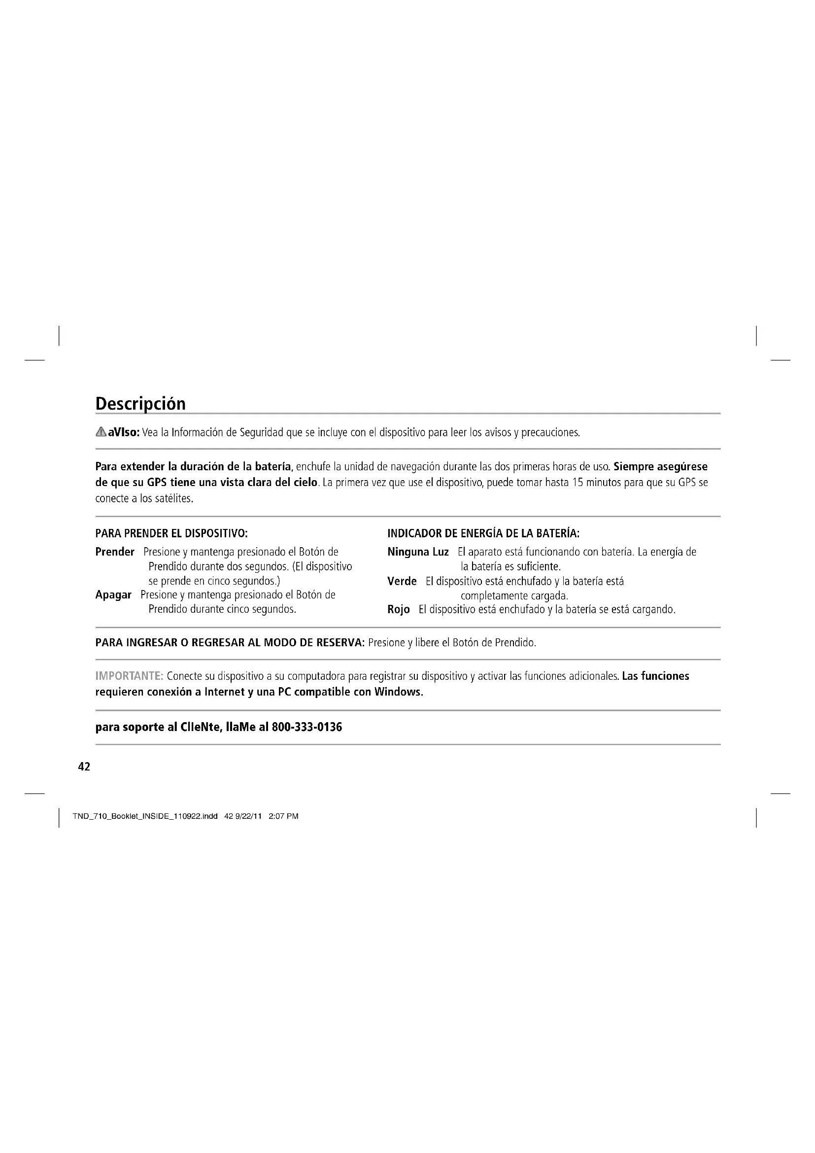 TND_710_Booklet_INSIDE_110922.indd 41 9/22/11 2:07 PMDescripción aVIso: Vea la Información de Seguridad que se incluye con el dispositivo para leer los avisos y precauciones. Para extender la duración de la batería, enchufe la unidad de navegación durante las dos primeras horas de uso. Siempre asegúrese de que su GPS tiene una vista clara del cielo. La primera vez que use el dispositivo, puede tomar hasta 15 minutos para que su GPS se conecte a los satélites. PARA INGRESAR O REGRESAR AL MODO DE RESERVA: Presione y libere el Botón de Prendido. IMPORTANTE: Conecte su dispositivo a su computadora para registrar su dispositivo y activar las funciones adicionales. Las funciones requieren conexión a Internet y una PC compatible con Windows. para soporte al ClIeNte, llame al 800-333-0136 PARA PRENDER EL DISPOSITIVO: Prender Presione y mantenga presionado el Botón de Prendido durante dos segundos. (El dispositivo se prende en cinco segundos.) Apagar Presione y mantenga presionado el Botón de Prendido durante cinco segundos. INDICADOR DE ENERGÍA DE LA BATERÍA: Ninguna Luz El aparato está funcionando con batería. La energía de la batería es suficiente. Verde El dispositivo está enchufado y la batería está completamente cargada. Rojo El dispositivo está enchufado y la batería se está cargando.