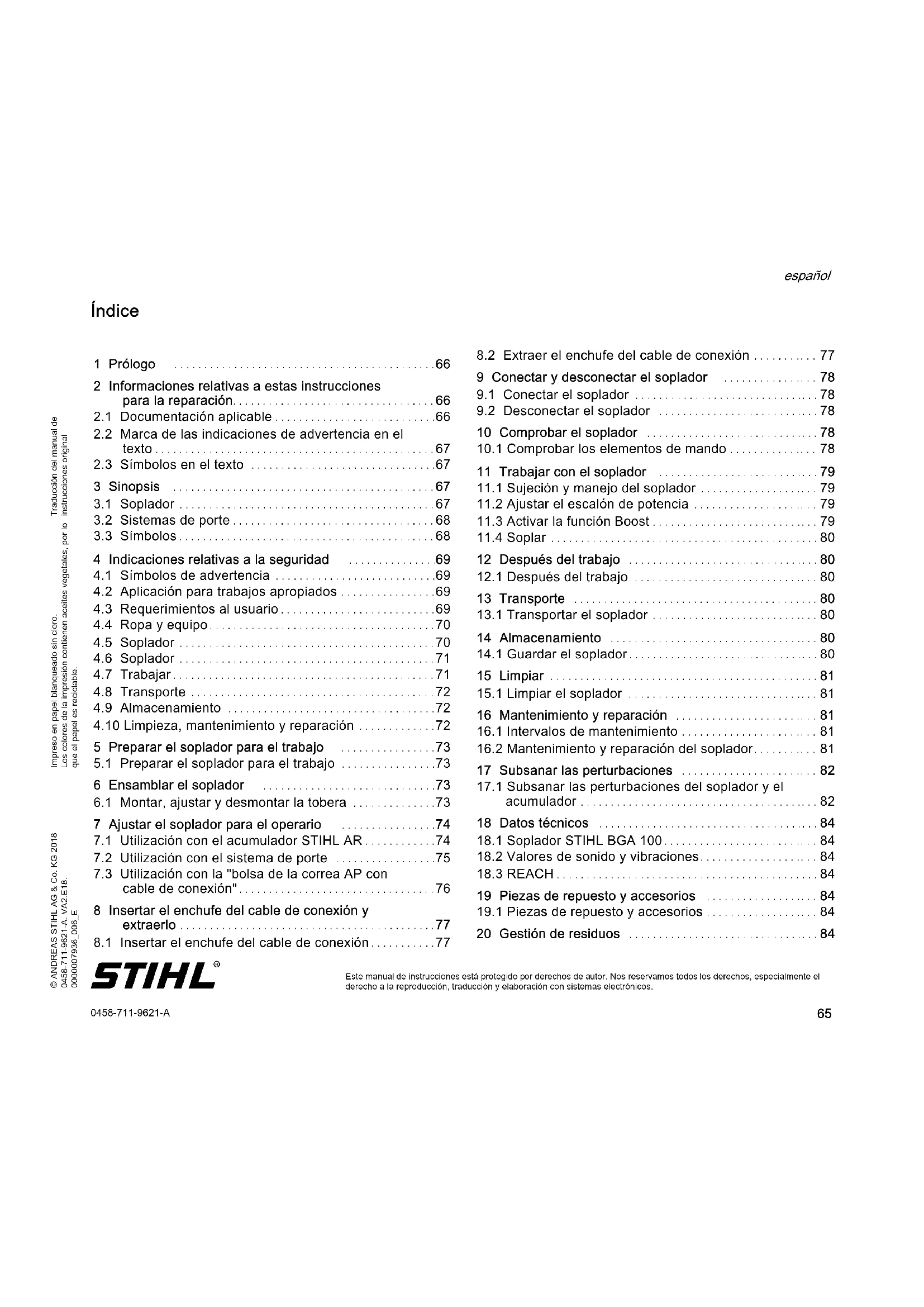 ANDREAS STIHL AG & Co. KG 18 Datos técnicos 19 Piezas de repuesto y accesorios Estos símbolos caracterizan las piezas de repuestoSTIHL y los accesorios originalesSTIHL. 20 Gestión de residuos 21 Declaración de conformidadUE0458-711-9621-A