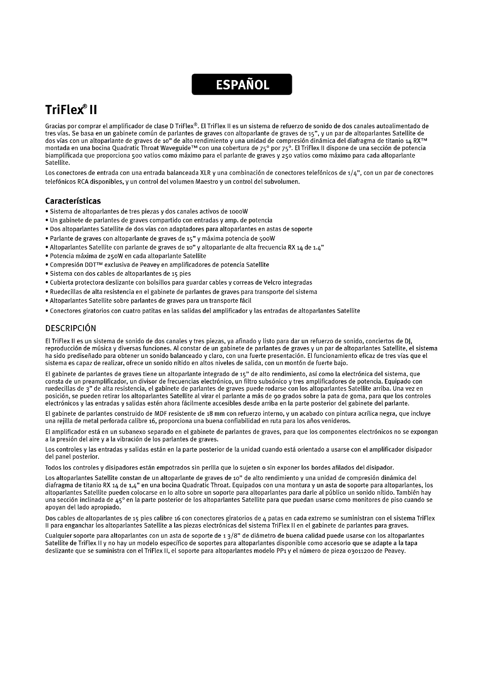- Conectores giratorios con cuatro patitas en las salidas del amplificador y las entradas de altoparlantes Satellite DESCRIPCIÓN El TriFlex II es un sistema de sonido de dos canales y tres piezas, ya afinado y listo para dar un refuerzo de sonido, conciertos de DJ, reproducción de música y diversas funciones. Al constar de un gabinete de parlantes de graves y un par de altoparlantes Satellite, el sistema ha sido prediseñado para obtener un sonido balanceado y claro, con una fuerte presentación. El funcionamiento eficaz de tres vías que el sistema es capaz de realizar, ofrece un sonido nítido en altos niveles de salida, con un montón de fuerte bajo. El gabinete de parlantes de graves tiene un altoparlante integrado de 15” de alto rendimiento, así como la electrónica del sistema, que consta de un preamplificador, un divisor de frecuencias electrónico, un filtro subsónico y tres amplificadores de potencia. Equipado con ruedecillas de 3” de alta resistencia, el gabinete de parlantes de graves puede rodarse con los altoparlantes Satellite arriba. Una vez en posición, se pueden retirar los altoparlantes Satellite al virar el parlante a más de 90 grados sobre la pata de goma, para que los controles electrónicos y las entradas y salidas estén ahora fácilmente accesibles desde arriba en la parte posterior del gabinete del parlante. El gabinete de parlantes construido de MDF resistente de 18 mm con refuerzo interno, y un acabado con pintura acrílica negra, que incluye una rejilla de metal perforada calibre 16, proporciona una buena confiabilidad en ruta para los años venideros. El amplificador está en un subanexo separado en el gabinete de parlantes de graves, para que los componentes electrónicos no se expongan a la presión del aire y a la vibración de los parlantes de graves. Los controles y las entradas y salidas están en la parte posterior de la unidad cuando está orientado a usarse con el amplificador disipador del panel posterior. Todos los controles y disipadores están empotrados sin perilla que lo sujeten o sin exponer los bordes afilados del disipador. Los altoparlantes Satellite constan de un altoparlante de graves de 10” de alto rendimiento y una unidad de compresión dinámica del diafragma de titanio RX 14 de 1,4” en una bocina Quadratic Throat. Equipados con una montura y un asta de soporte para altoparlantes, los altoparlantes Satellite pueden colocarse en lo alto sobre un soporte para altoparlantes para darle al público un sonido nítido. También hay una sección inclinada de 45° en la parte posterior de los altoparlantes Satellite para que puedan usarse como monitores de piso cuando se apoyan del lado apropiado. Dos cables de altoparlantes de 15 pies calibre 16 con conectores giratorios de 4 patas en cada extremo se suministran con el sistema TriFlex II para enganchar los altoparlantes Satellite a las piezas electrónicas del sistema TriFlex II en el gabinete de parlantes para graves. Cualquier soporte para altoparlantes con un asta de soporte de 1 3/8” de diámetro de buena calidad puede usarse con los altoparlantes Satellite de TriFlex II y no hay un modelo específico de soportes para altoparlantes disponible como accesorio que se adapte a la tapa deslizante que se suministra con el TriFlex II, el soporte para altoparlantes modelo PP1 y el número de pieza 03011200 de Peavey. ESPAÑOL3