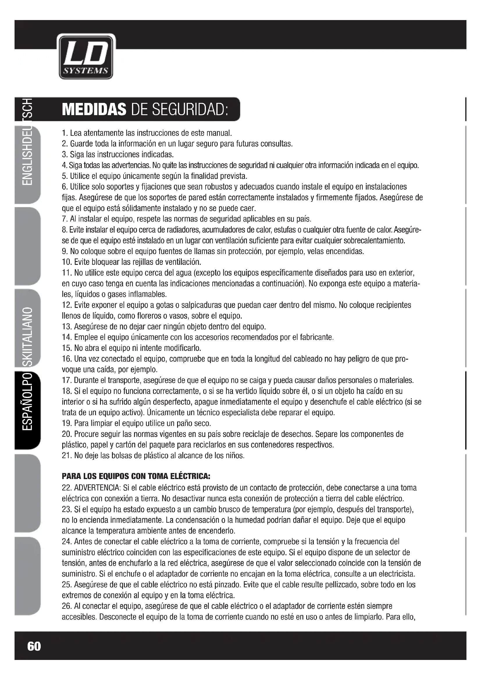 ENGLISHDEUTSCHFRANCAIS FRANCAISFRANCAIS FRANCAISFRANCAIS ESPAÑOLPOLSKIITALIANO57 ITALIANOPOLSKIESPAÑOL FRANCAISFRANCAIS FRANCAISFRANCAIS FRANCAISDEUTSCHENGLISHIntroducción Gracias a su gran flexibilidad, el splitter/mezclador LDMS828 de LD Systems es la solución ideal para muchas aplicaciones. Todas las entradas y salidas son balanceadas, y su diseño claro, por ejemplo, los indicadores de nivel en cada canal, permite una operación muy intuitiva. Se puede usar como mezclador de 8 a 2, como distribuidor de señal de 2 a 8, o como una combinación de ambos, por lo que el LDMS828 es una herramienta indispensable en presentaciones en vivo, estudios de grabación, o instalaciones fijas. ¡Gracias por elegir LD-Systems! Este equipo está diseñado y fabricado con los estándares de calidad más exigentes, para garantizar un correcto funcionamiento durante muchos años. Los productos de LD-Systems se caracterizan por su gran calidad, avala- da por el prestigio de la marca y una dilatada experiencia como fabricante. Lea atentamente este manual de usuario para poder aprovechar rápidamente toda la funcionalidad de su nuevo producto de LD Systems. Si desea obtener información sobre LD-SYSTEMS, visite nuestro sitio web WWW.LD-SYSTEMS.COM