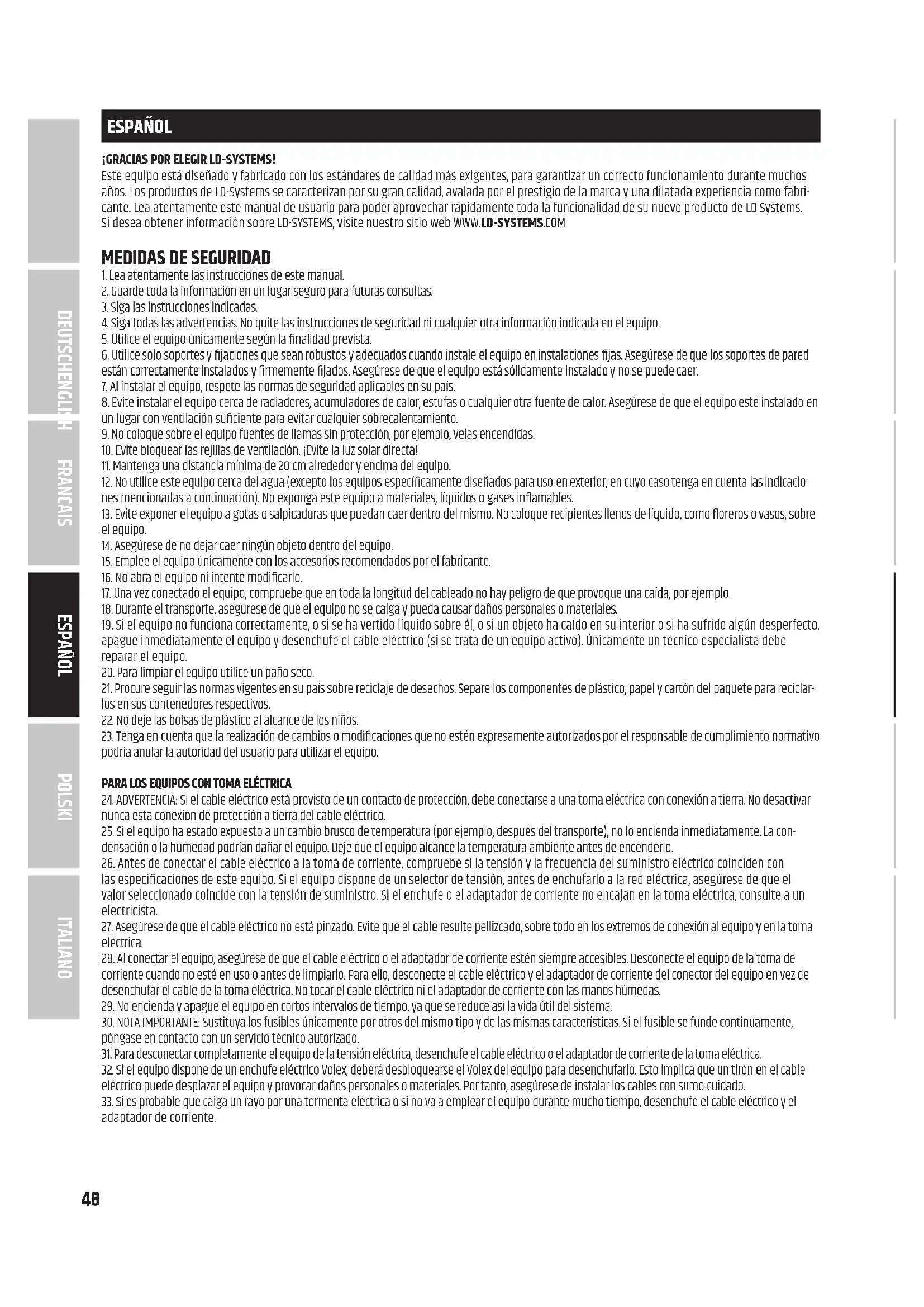 Connecteur: Mini-XLR à 3broches Mini-XLR à 3broches Mini-XLR à 3broches Accessoires fournis: Bonnette anti-vent en mousse Bonnette anti-vent en mousse Bonnette anti-vent en mousse48 ITALIANO POLSKI ESPAÑOL FRANCAIS DEUTSCHENGLISH ESPAÑOL ¡GRACIAS POR ELEGIR LD-SYSTEMS! Este equipo está diseñado y fabricado con los estándares de calidad más exigentes, para garantizar un correcto funcionamiento durante muchos años. Los productos de LD-Systems se caracterizan por su gran calidad, avalada por el prestigio de la marca y una dilatada experiencia como fabri- cante. Lea atentamente este manual de usuario para poder aprovechar rápidamente toda la funcionalidad de su nuevo producto de LD Systems. Si desea obtener información sobre LD-SYSTEMS, visite nuestro sitio web WWW.LD-SYSTEMS.COM