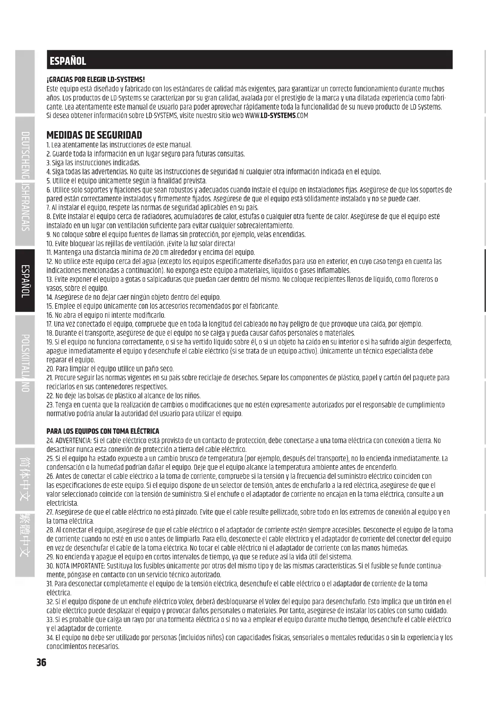 ESPAÑOL ¡GRACIAS POR ELEGIR LD-SYSTEMS! Este equipo está diseñado y fabricado con los estándares de calidad más exigentes, para garantizar un correcto funcionamiento durante muchos años. Los productos de LD-Systems se caracterizan por su gran calidad, avalada por el prestigio de la marca y una dilatada experiencia como fabri- cante. Lea atentamente este manual de usuario para poder aprovechar rápidamente toda la funcionalidad de su nuevo producto de LD Systems. Si desea obtener información sobre LD-SYSTEMS, visite nuestro sitio web WWW.LD-SYSTEMS.COM