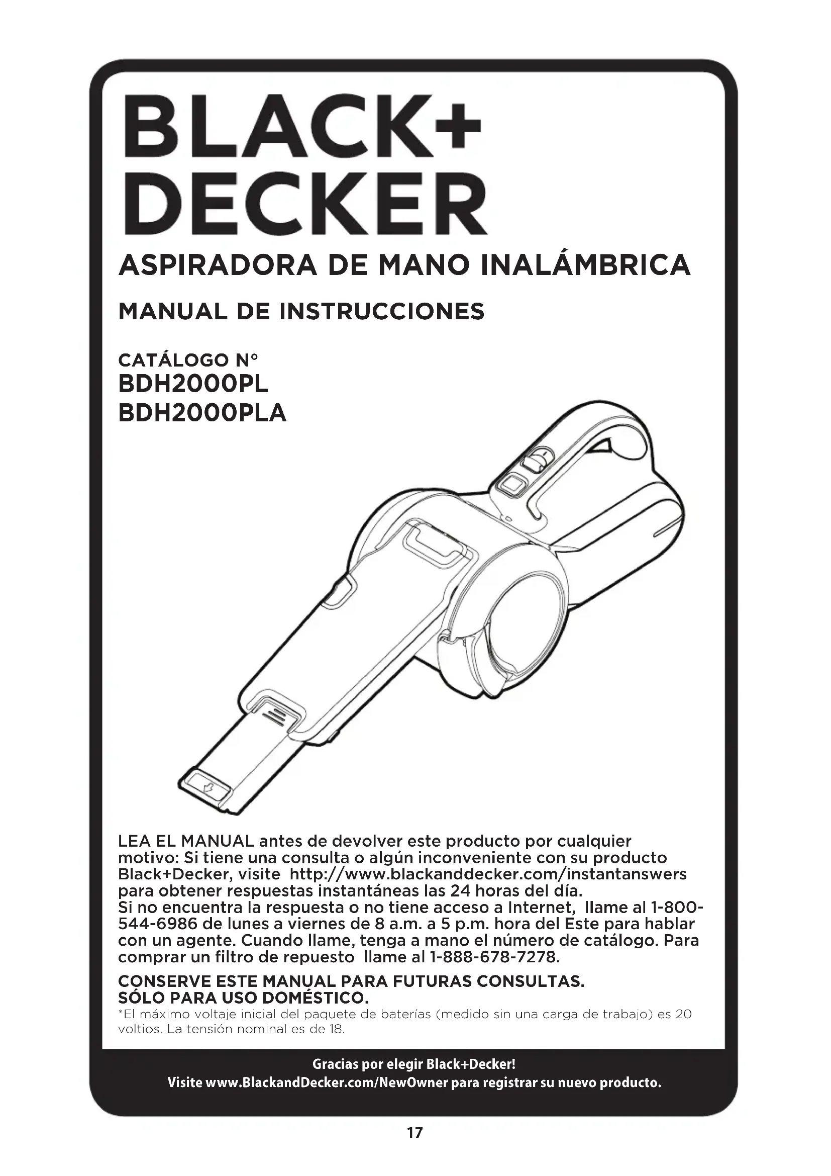 LEA EL MANUAL antes de devolver este producto por cualquier motivo: Si tiene una consulta o algún inconveniente con su producto Black+Decker, visite http://www.blackanddecker.com/instantanswers para obtener respuestas instantáneas las 24 horas del día. Si no encuentra la respuesta o no tiene acceso a Internet, llame al 1-800- 544-6986 de lunes a viernes de 8 a.m. a 5 p.m. hora del Este para hablar con un agente. Cuando llame, tenga a mano el número de catálogo. Para comprar un filtro de repuesto llame al 1-888-678-7278. CONSERVE ESTE MANUAL PARA FUTURAS CONSULTAS. SÓLO PARA USO DOMÉSTICO. *El máximo voltaje inicial del paquete de baterías (medido sin una carga de trabajo) es 20 voltios. La tensión nominal es de 18.Gracias por elegir Black+Decker! Visite www.BlackandDecker.com/NewOwner para registrar su nuevo producto.