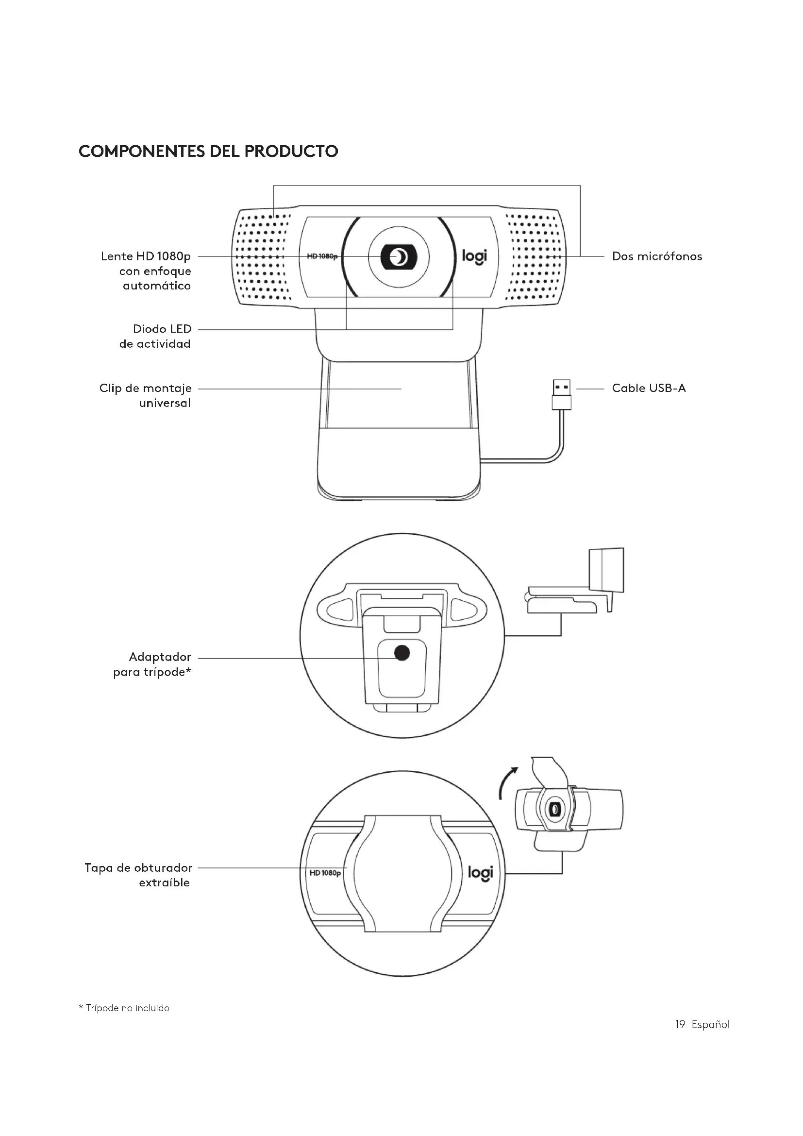 - Trípode no incluido 19 EspañolCOLOCA LA TAPA DE OBTURADOR 1 Localiza la lente en la cámara Web y acopla latapa de obturador.