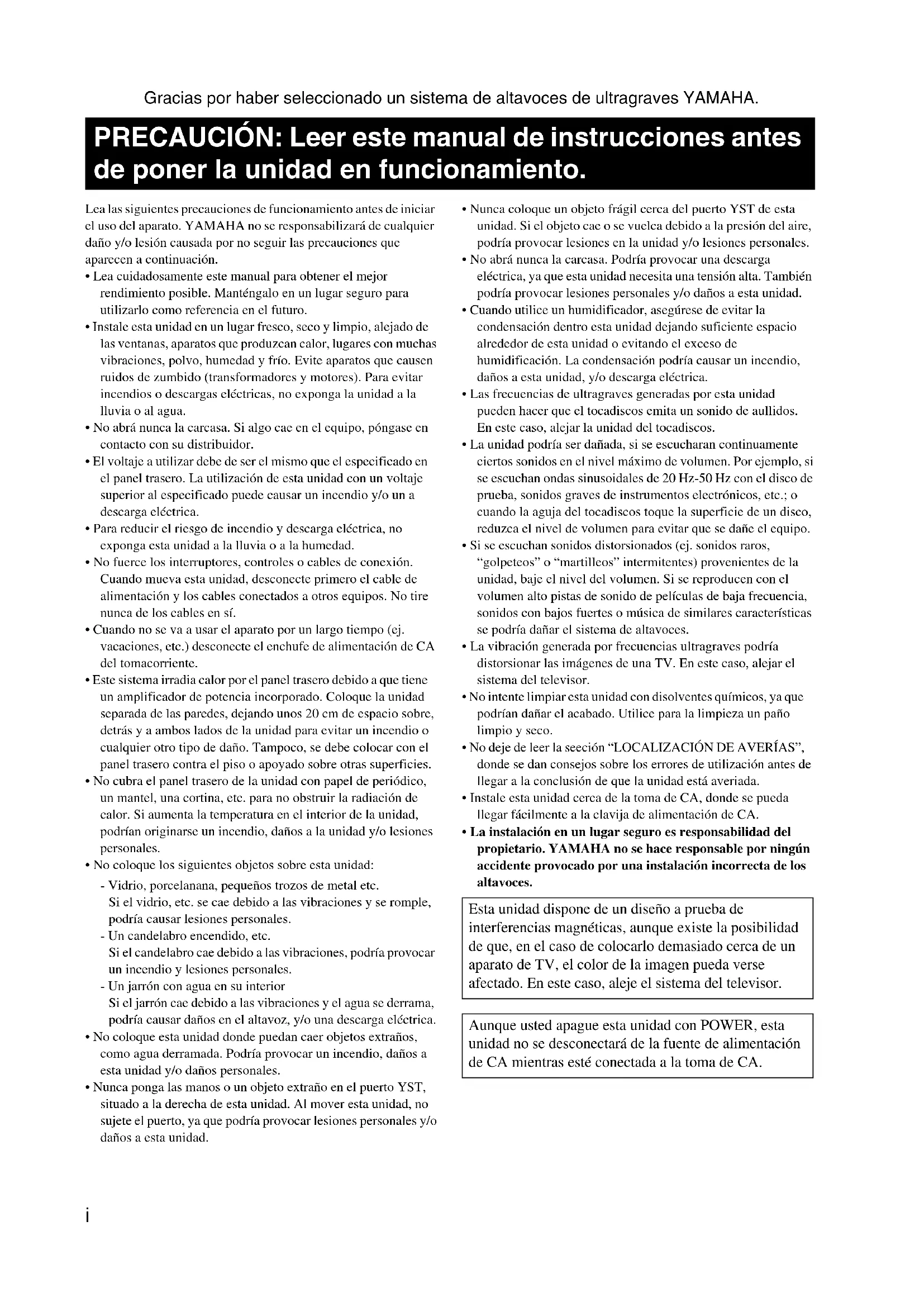 - La instalación en un lugar seguro es responsabilidad del propietario. YAMAHA no se hace responsable por ningún accidente provocado por una instalación incorrecta de los altavoces. PRECAUCIÓN: Leer este manual de instrucciones antes de poner la unidad en funcionamiento. Esta unidad dispone de un diseño a prueba de interferencias magnéticas, aunque existe la posibilidad de que, en el caso de colocarlo demasiado cerca de un aparato de TV, el color de la imagen pueda verse afectado. En este caso, aleje el sistema del televisor. Aunque usted apague esta unidad con POWER, esta unidad no se desconectará de la fuente de alimentación de CA mientras esté conectada a la toma de CA.1 Español CARACTERÍSTICAS..................................................... 1 ACCESORIOS INCLUIDOS.......................................... 1 UBICACIÓN...................................................................2 CONEXIONES............................................................... 3 Conexión a los terminales (toma para clavija) de salida de línea del amplificador ...................... 3 Conexión a los terminales de salida de los altavoces del amplificador ............................. 5 Conexión a los terminales INPUT1/OUTPUT del altavoz de ultragraves .......................................... 7 Enchufe el altavoz de ultragraves al tomacorriente CA ....................................................... 7