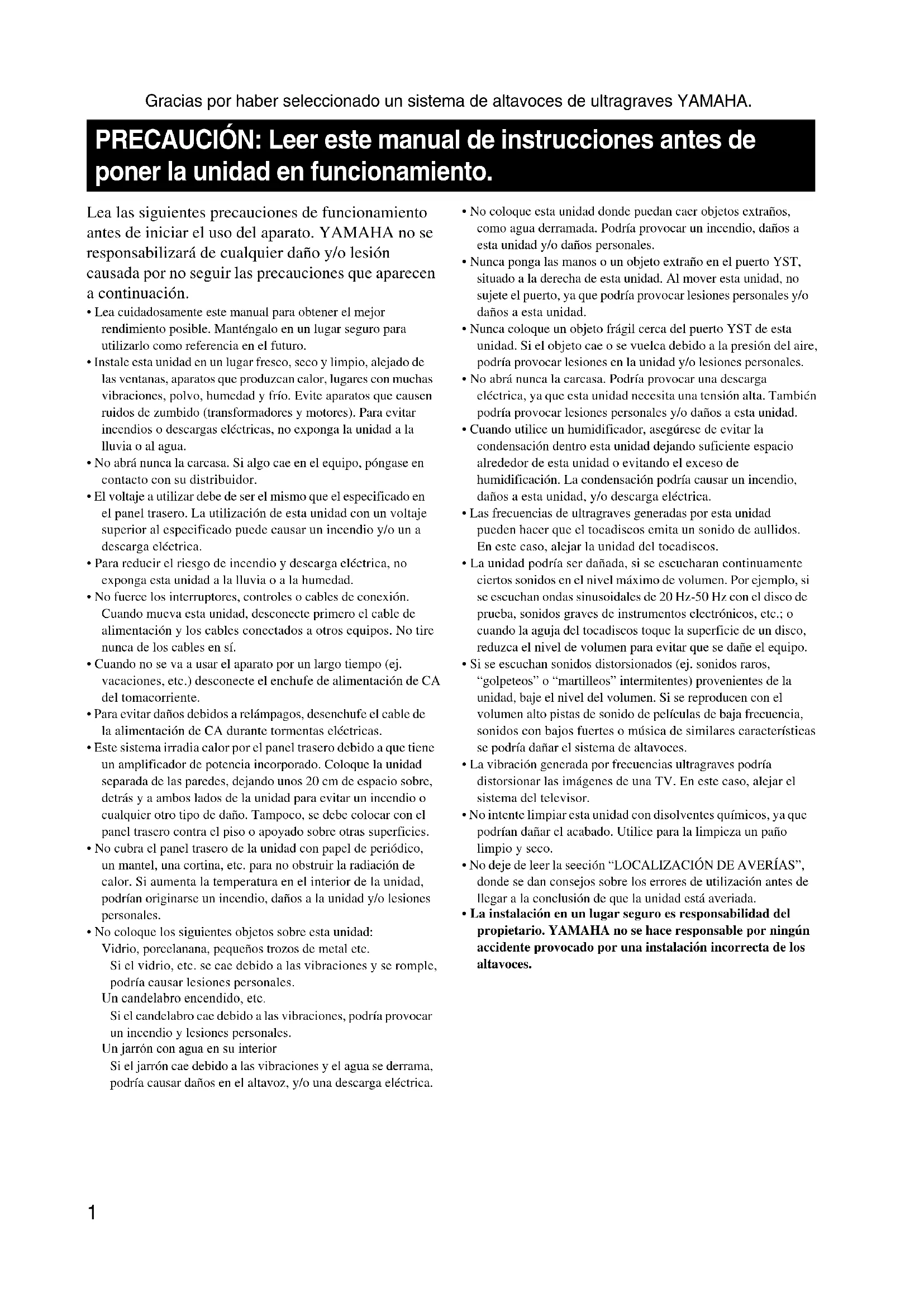 - La instalación en un lugar seguro es responsabilidad del propietario. YAMAHA no se hace responsable por ningún accidente provocado por una instalación incorrecta de los altavoces. PRECAUCIÓN: Leer este manual de instrucciones antes de poner la unidad en funcionamiento.