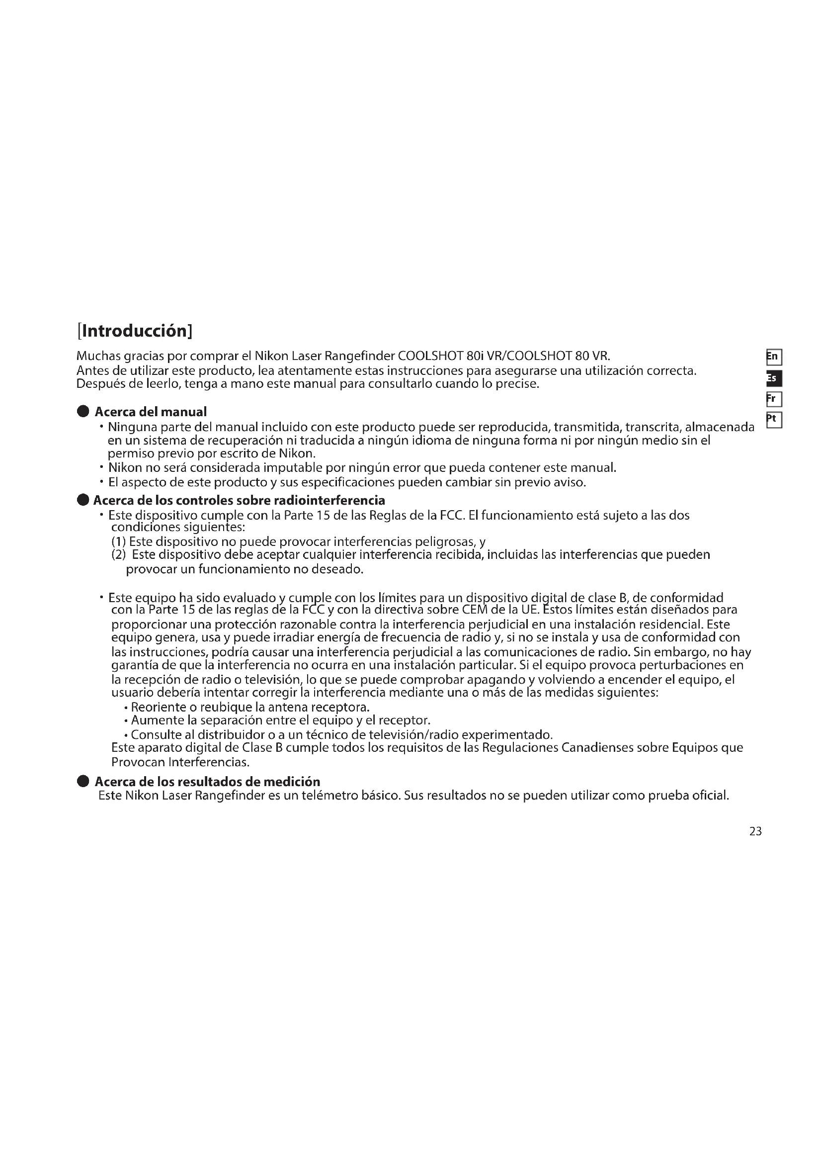 - Consulte al distribuidor o a un técnico de televisión/radio experimentado. Este aparato digital de Clase B cumple todos los requisitos de las Regulaciones Canadienses sobre Equipos que Provocan Interferencias. ● Acerca de los resultados de medición Este Nikon Laser Rangefinder es un telémetro básico. Sus resultados no se pueden utilizar como prueba oficial. [Introducción] Muchas gracias por comprar el Nikon Laser Rangefinder COOLSHOT 80i VR/COOLSHOT 80 VR. Antes de utilizar este producto, lea atentamente estas instrucciones para asegurarse una utilización correcta. Después de leerlo, tenga a mano este manual para consultarlo cuando lo precise.24