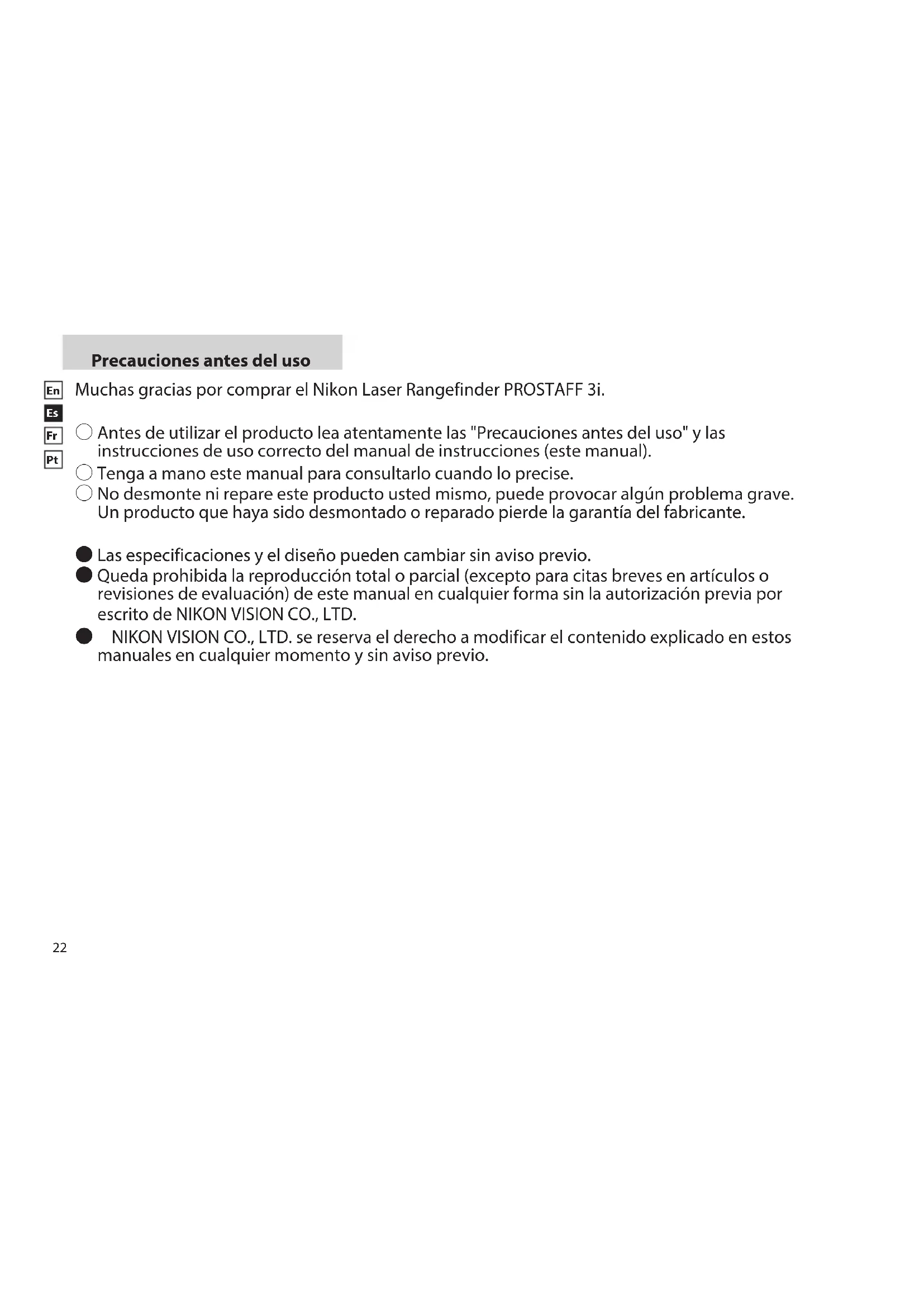 Precauciones antes del uso Muchas gracias por comprar el Nikon Laser Rangefinder PROSTAFF 3i. 〇 Antes de utilizar el producto lea atentamente las "Precauciones antes del uso" y las instrucciones de uso correcto del manual de instrucciones (este manual). 〇 Tenga a mano este manual para consultarlo cuando lo precise. 〇 No desmonte ni repare este producto usted mismo, puede provocar algún problema grave. Un producto que haya sido desmontado o reparado pierde la garantía del fabricante. ● Las especificaciones y el diseño pueden cambiar sin aviso previo. ● Queda prohibida la reproducción total o parcial (excepto para citas breves en artículos o revisiones de evaluación) de este manual en cualquier forma sin la autorización previa por escrito de NIKON VISION CO., LTD. ● NIKON VISION CO., LTD. se reserva el derecho a modificar el contenido explicado en estos manuales en cualquier momento y sin aviso previo.23