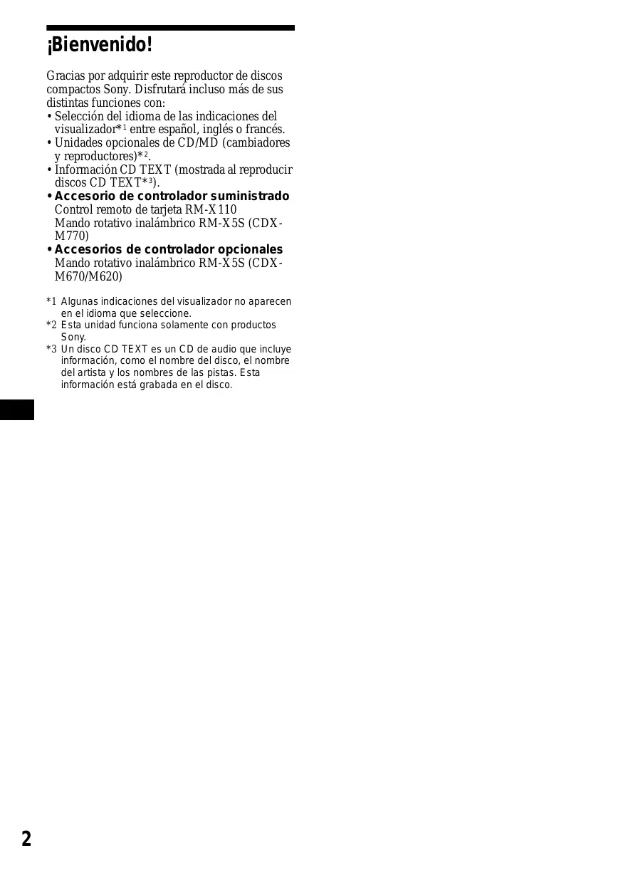 Gracias por adquirir este reproductor de discos compactos Sony. Disfrutará incluso más de sus distintas funciones con: • Selección del idioma de las indicaciones del visualizador*1 entre español, inglés o francés. • Unidades opcionales de CD/MD (cambiadores y reproductores)*2. • Información CD TEXT (mostrada al reproducir discos CD TEXT*3). • Accesorio de controlador suministrado Control remoto de tarjeta RM-X110 Mando rotativo inalámbrico RM-X5S (CDXM770) • Accesorios de controlador opcionales Mando rotativo inalámbrico RM-X5S (CDXM670/M620) *1 Algunas indicaciones del visualizador no aparecen en el idioma que seleccione. *2 Esta unidad funciona solamente con productos Sony. *3 Un disco CD TEXT es un CD de audio que incluye información, como el nombre del disco, el nombre del artista y los nombres de las pistas. Esta información está grabada en el disco.