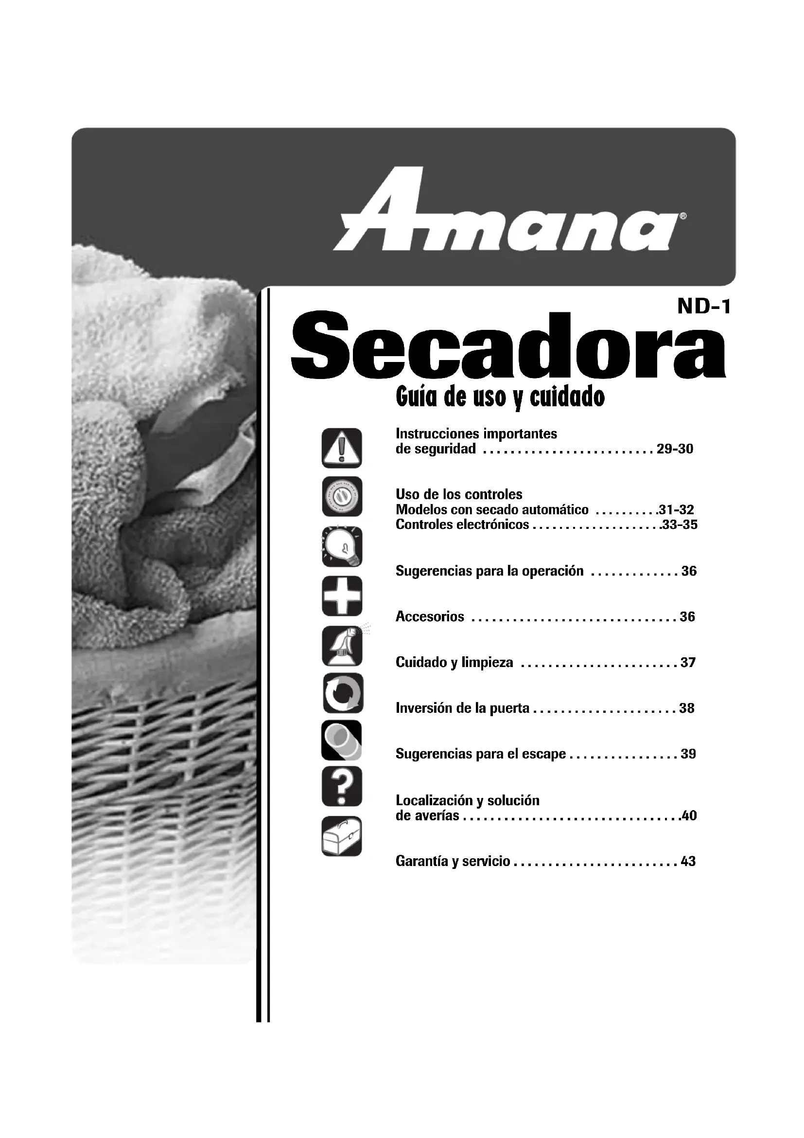 - Garantía y servicio ND-1 Secadora29 Por su seguridad, debe seguir las instrucciones de este manual para minimizar el riesgo de incendio o explosión o para evitar daños materiales, lesiones personales o la muerte. p. 43